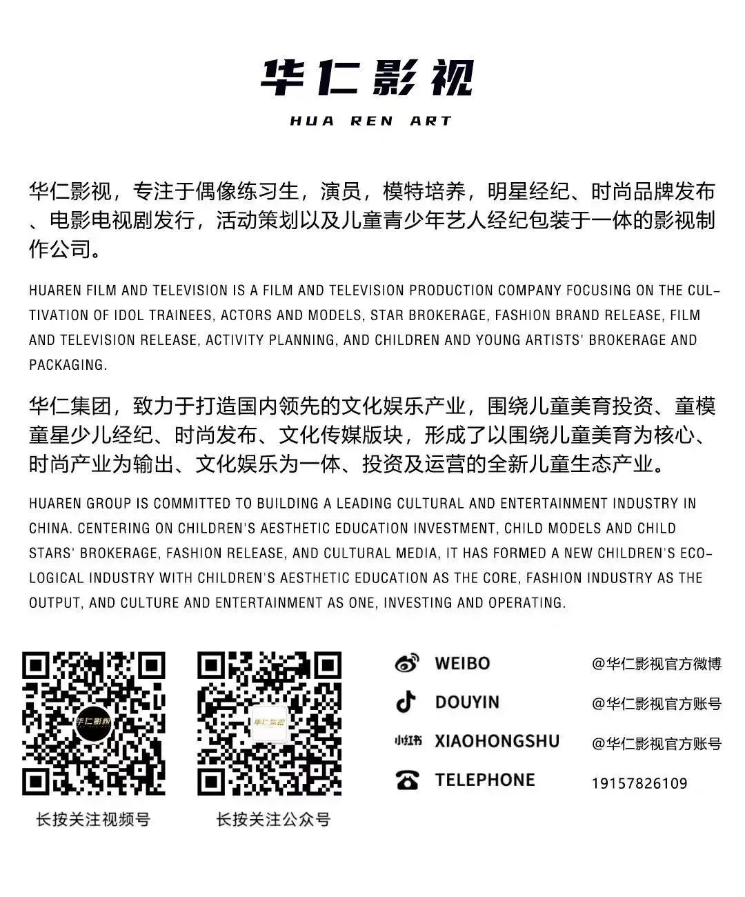 华仁影视,专注于偶像练习生,演员,模特培养,明星经纪、时尚品牌发布电影电视剧发行,活动策划以及儿童青少年艺人经纪包装于一体的影视制作公司。
