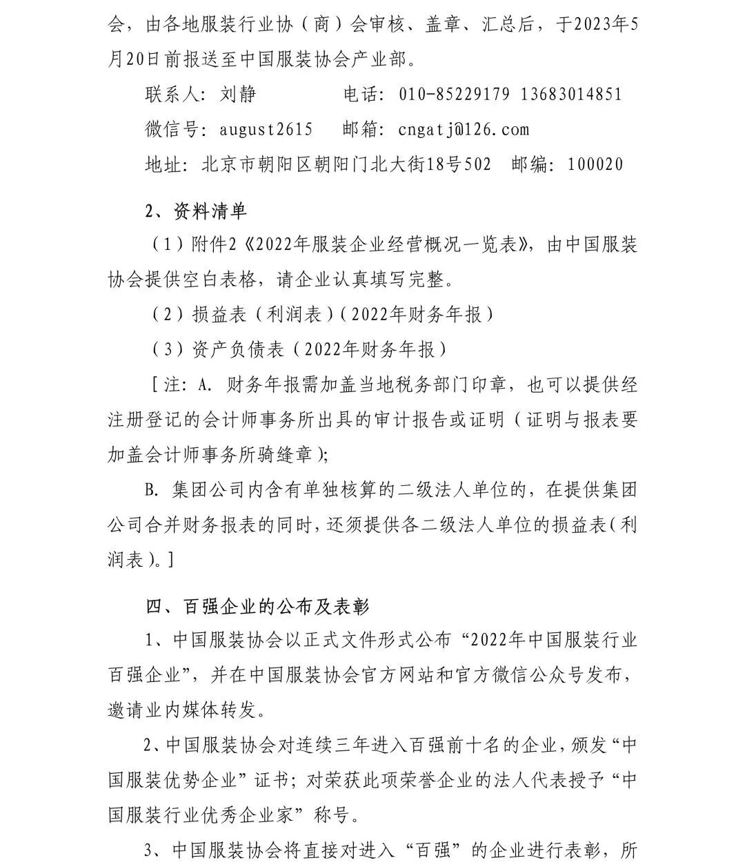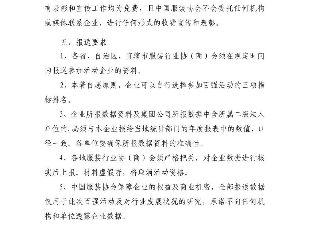 为宣传和展现我国服装行业优势企业发展状况,中国服装协会决定在会员单位范围内开展基于自愿参与原则的“2022年服装行业百强企业”评价活动。请我省申报企业按通知要求,在2023年5月16日前将报送资料(原件)一式两份、加盖当地税务部门印章或会计事务所出具的审计章,寄送至本会秘书处进行初步审核。