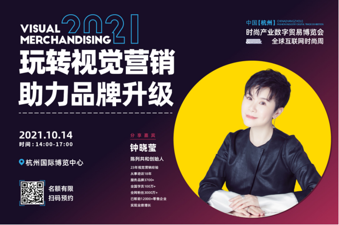 视觉营销对企业终端销售的重要作用已经成为业界的共识。为了满足众多时尚行业企业及从业者对视觉营销的巨大热情。中国【杭州】时尚产业数字贸易博览会特邀钟晓莹女士于2021年10月14日在杭州国际博览中心来带来一场关于视觉营销的超级线下课。