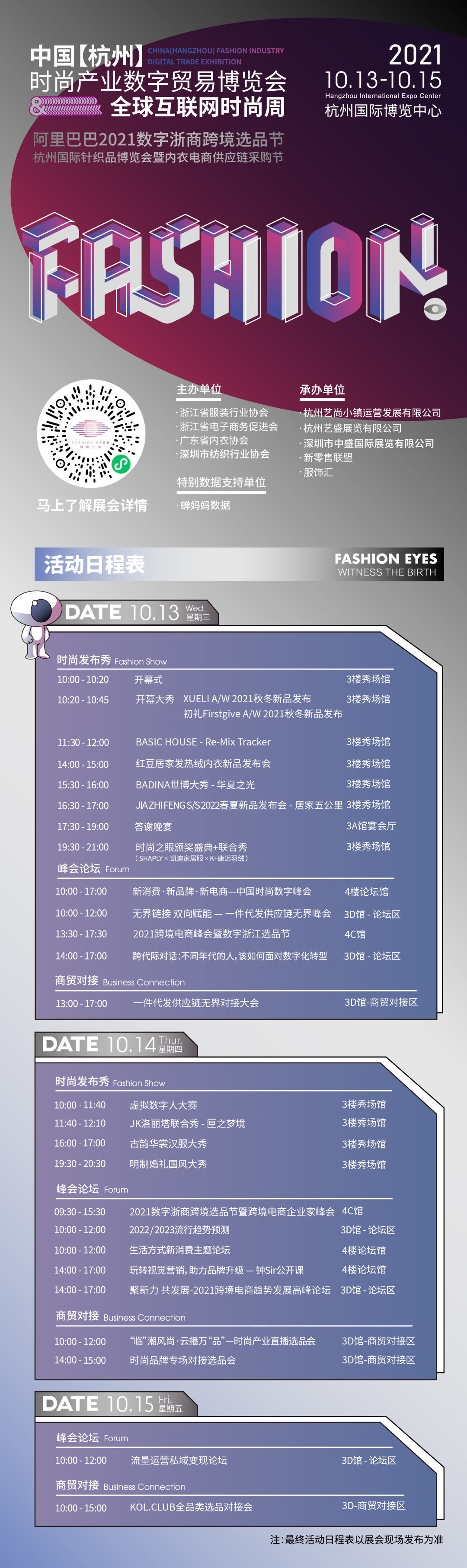 本届中国杭州时尚产业数字贸易博览会深度发掘数字技术产业价值,努力推进直播电商、社群电商、跨境电商、智能制造等新型数字渠道及能力与时尚产业的深度融合。组委会与阿里巴巴国际站、中国新零售联盟、浙江省电子商务促进会、国贸数字平台、佛系推手团、冷芸时尚、中赫时尚、陈列共和、蝶讯网、KOL.CLUB等多家机构进行深度合作,精心打造多场主题峰会、行业论坛及公开课,为时尚行业从业者带来极具价值的内容盛宴。