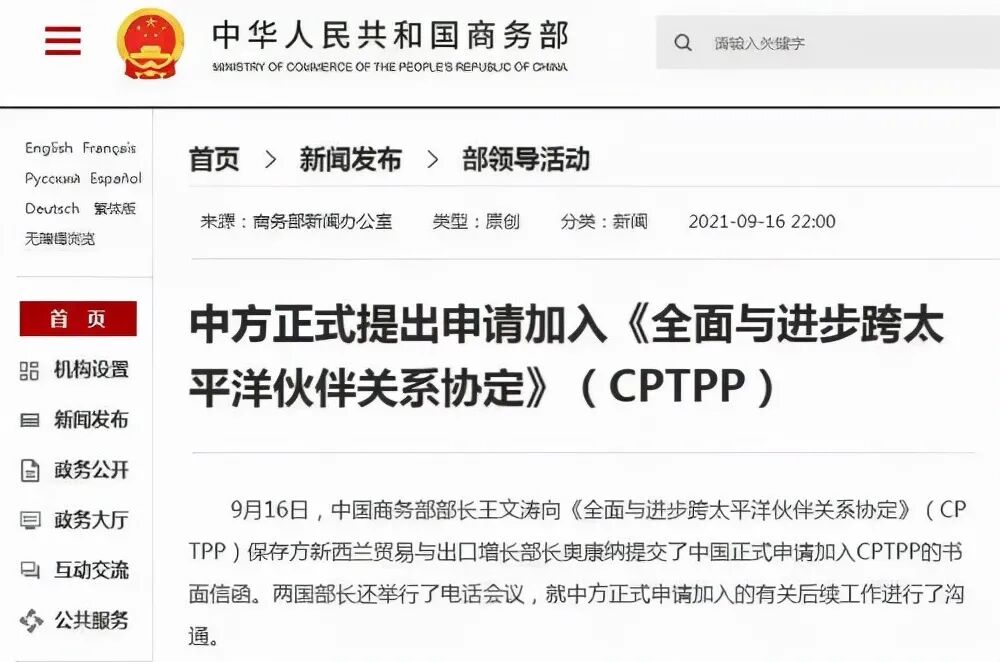 日前,商务部发布消息称:中方已申请加入《全面与进步跨太平洋伙伴关系协定》(CPTPP)。