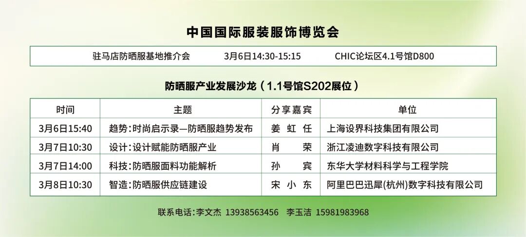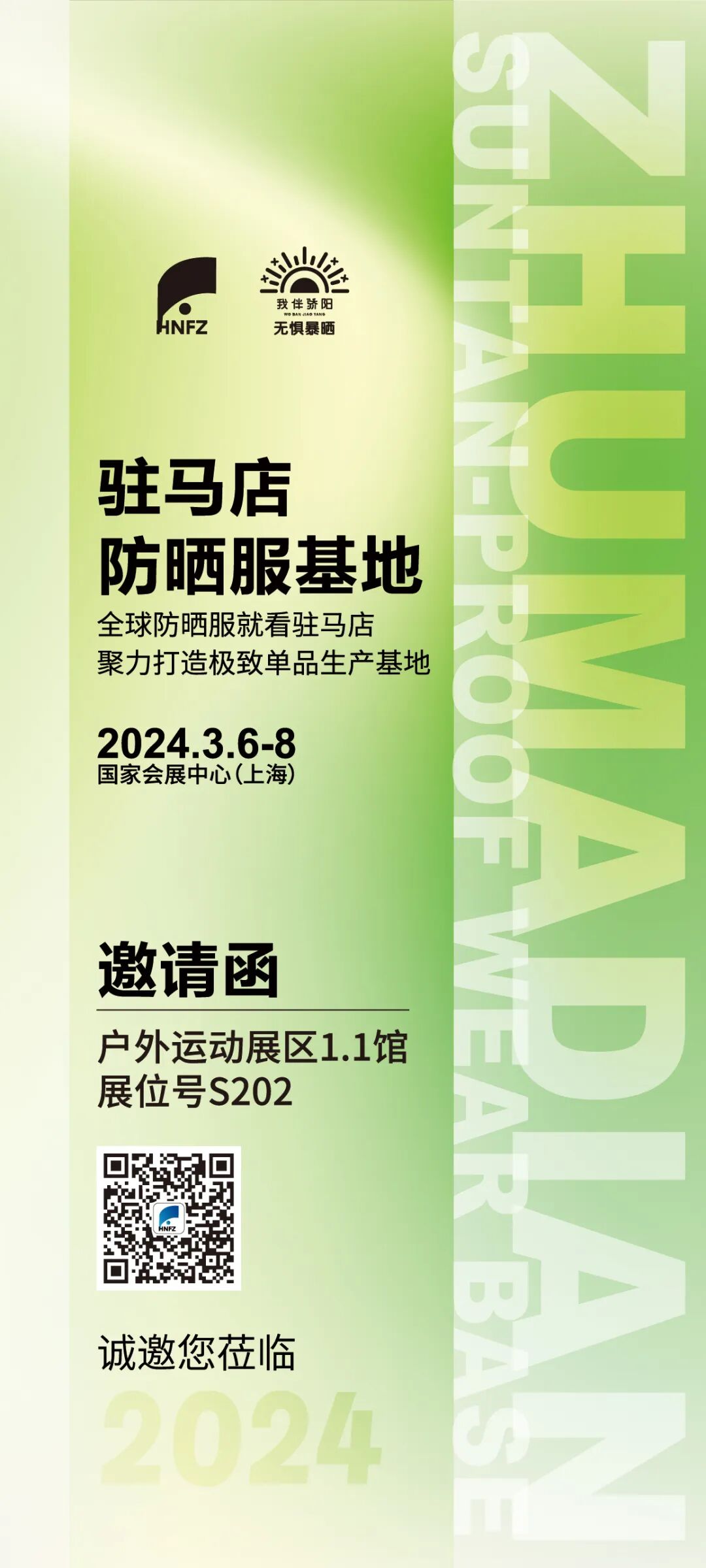 2024年3月6日至8日,河南省服装行业协会将与驻马店市、上蔡县、西平县人民政府合作,携手200余家驻马店防晒服基地共建单位共同亮相CHIC(春)。