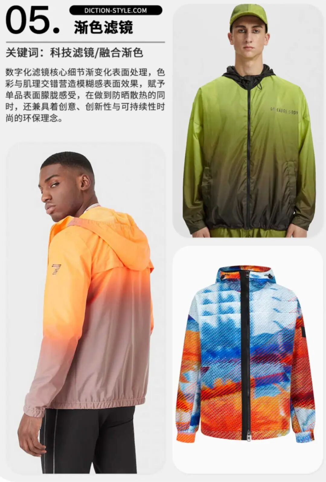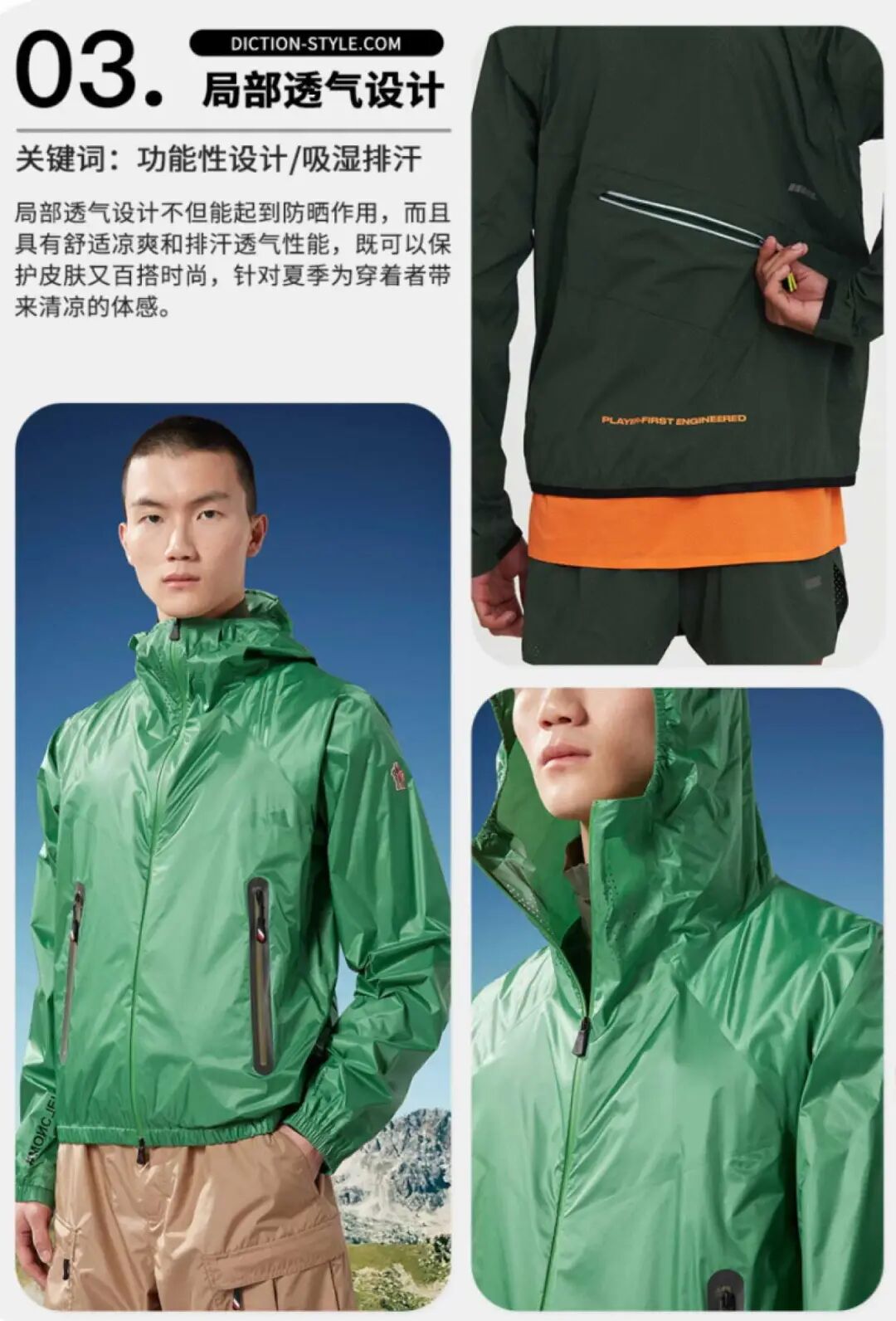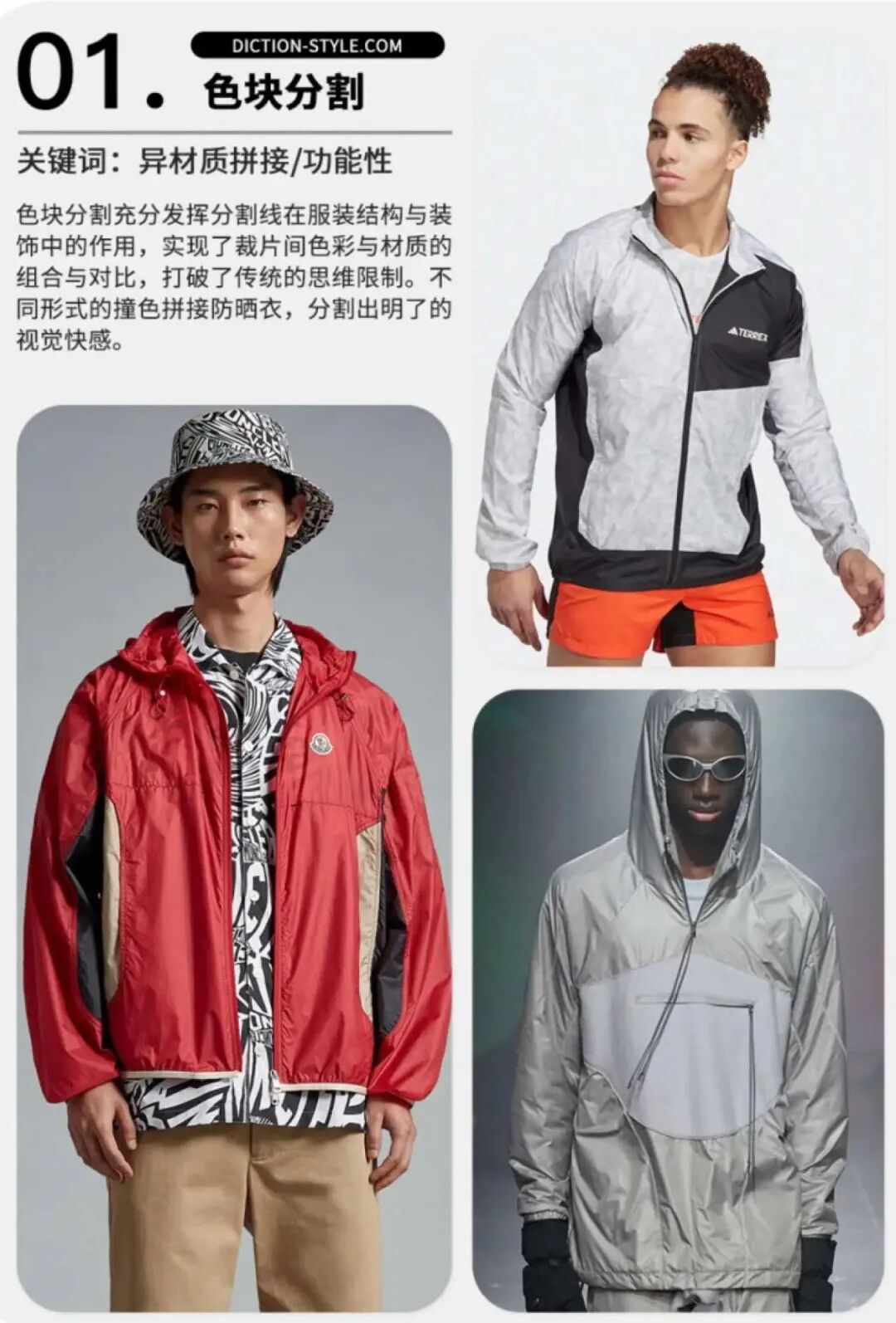 色块分割充分发挥分割线在服装结构与装饰中的作用,实现了裁片间色彩与材质的组合与对比,打破了传统的思维限制。不同形式的撞色拼接防晒衣,分割出明了的视觉快感。