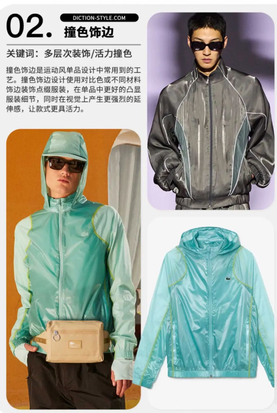 撞色饰边是运动风单品设计中常用到的工艺。撞色饰边设计使用对比色或不同材料饰边装饰点缀服装,在单品中更好地凸显服装细节,同时在视觉上产生更强烈的延伸感,让款式更具活力。