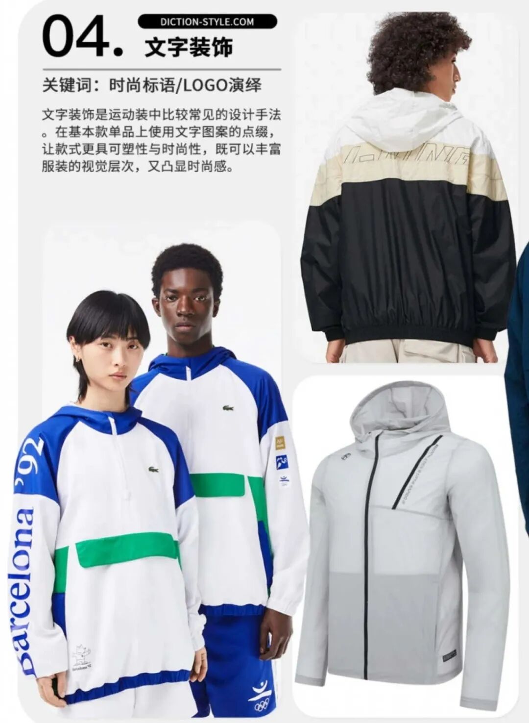 文字装饰是运动装中比较常见的设计手法。在基本款单品上使用文字图案的点缀,让款式更具可塑性与时尚性,既可以丰富服装的视觉层次,又凸显时尚感。