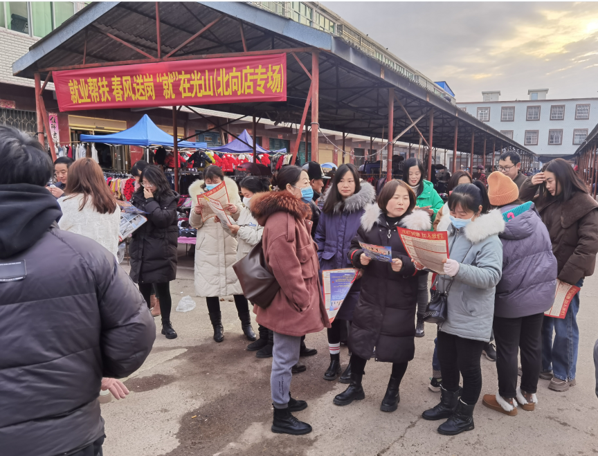 北向店乡携手信阳锦华服饰等四家企业在农村大集人员集聚的地点,悬挂宣传横幅、张贴招工海报、发放宣传单进行广泛宣传。