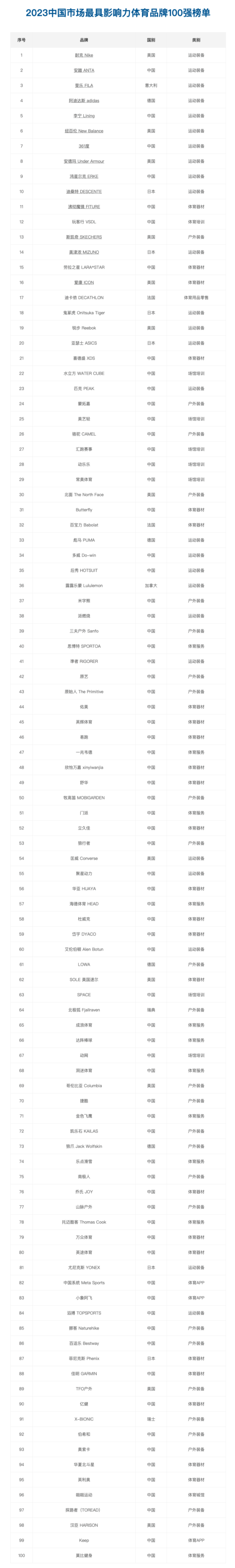 2023中国市场最具影响力体育品牌百强榜揭晓