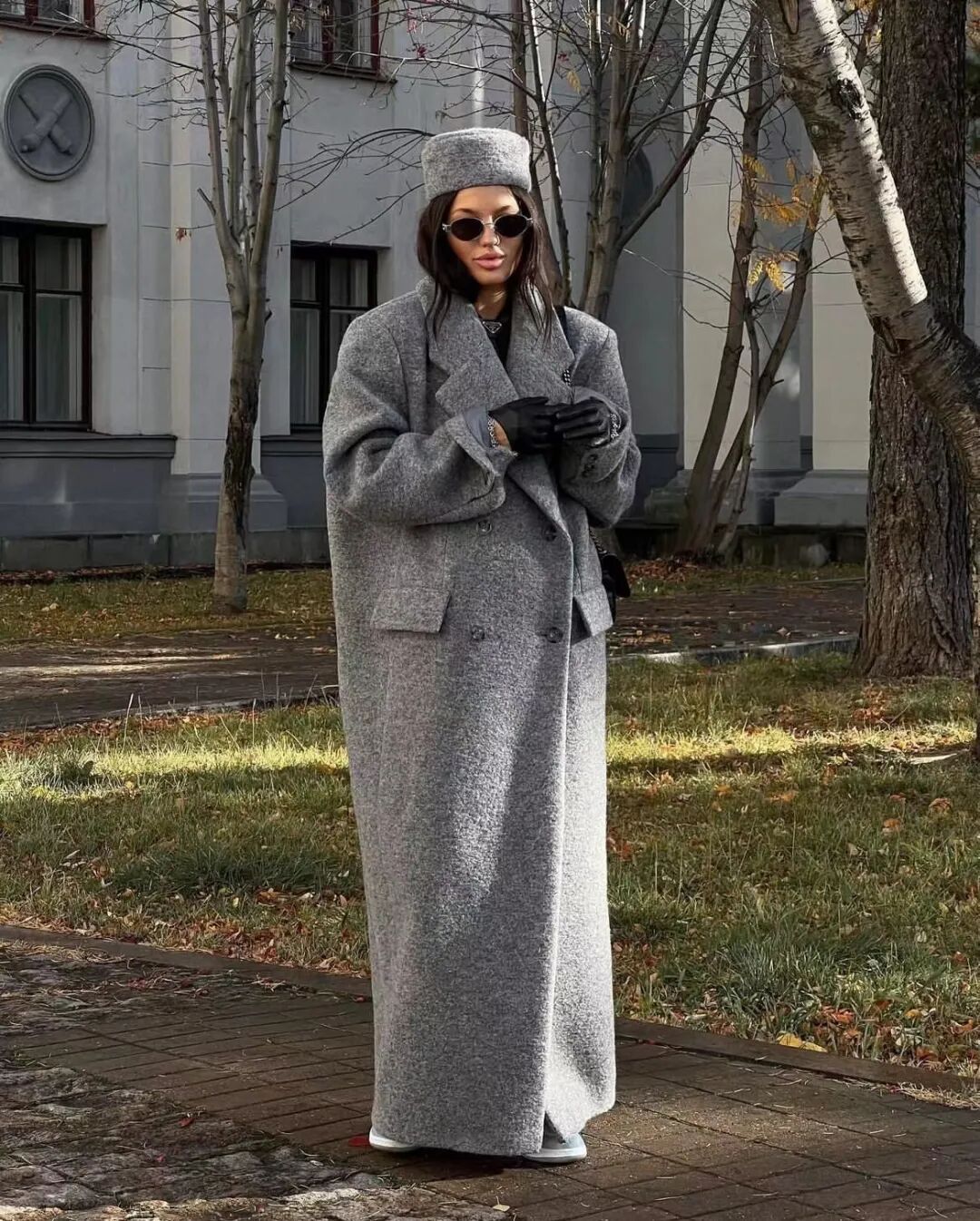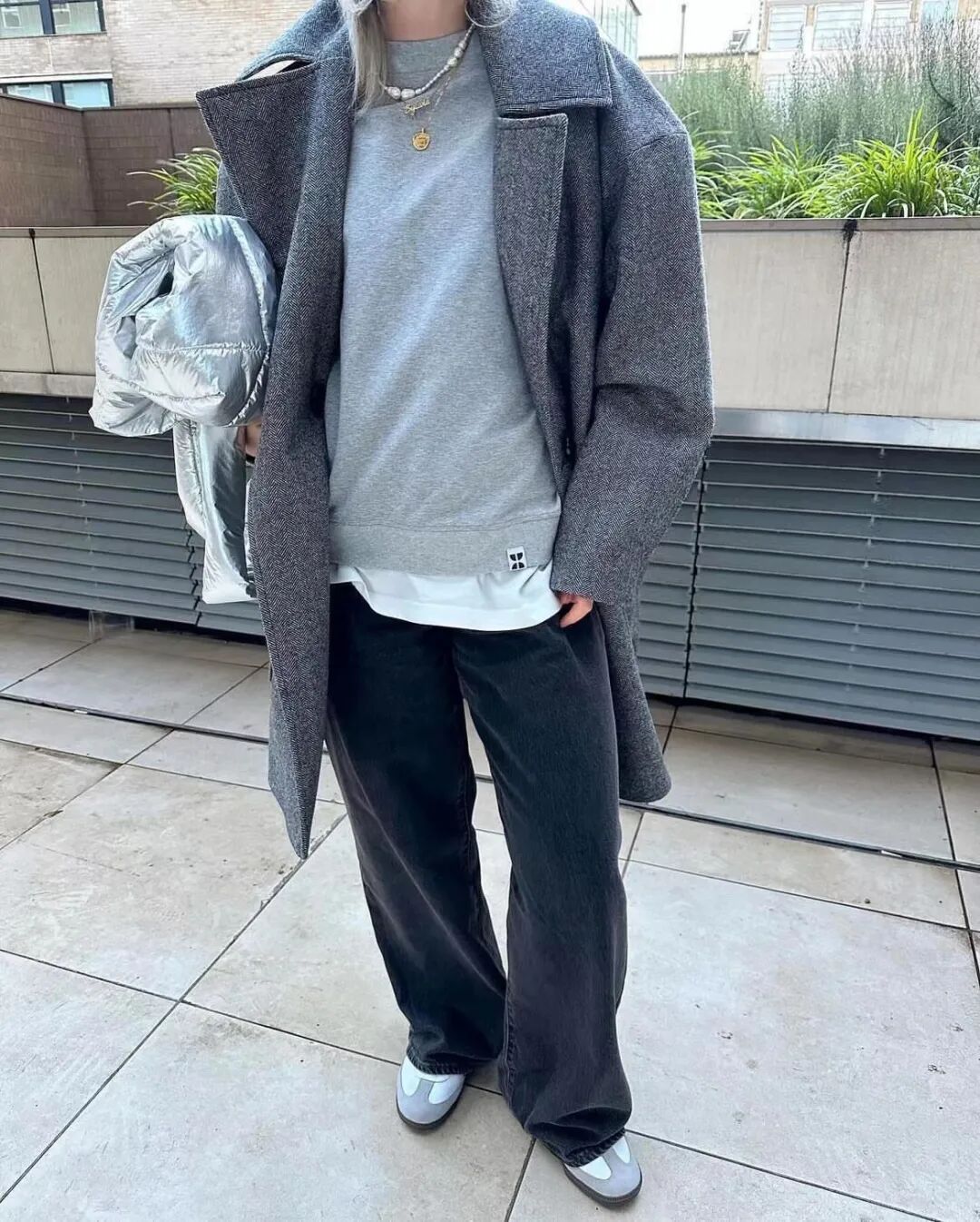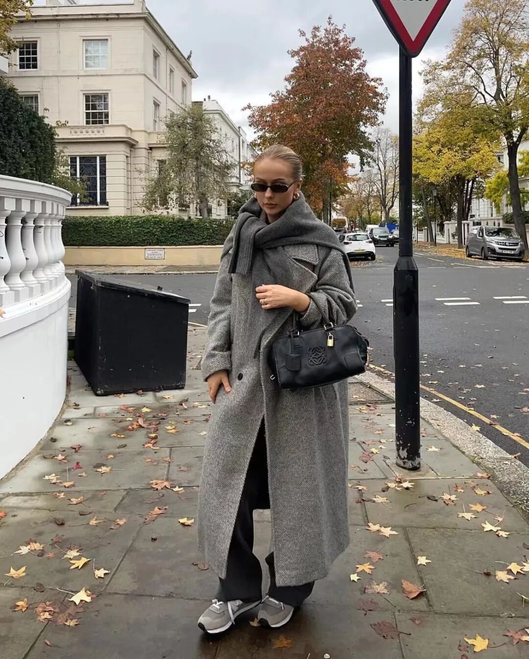 如果你觉得穿搭有些难度,那么一件能够盖住全身的灰色大衣就可以让你一件get格雷系穿搭,如果需要的话,也可搭配一条同色系的围巾或者其他配饰。就像在今年的无数街拍中,灰色大衣oversize亦是十分吸睛的存在——大气、简约、并且驾驭起来毫不费力,但一定要记住,内搭最好选择不会打乱大衣气场的黑白灰色效果会更好。