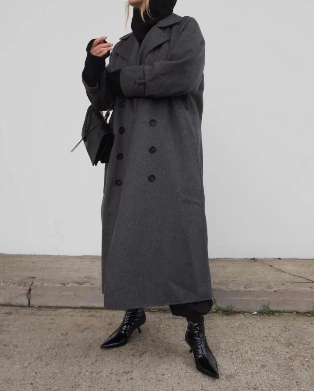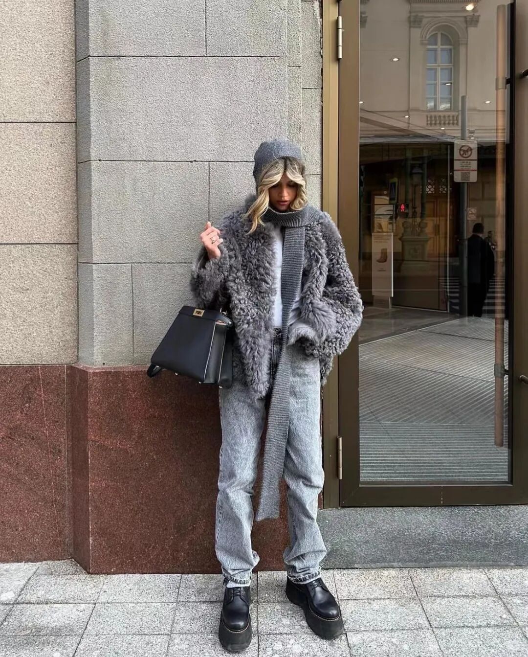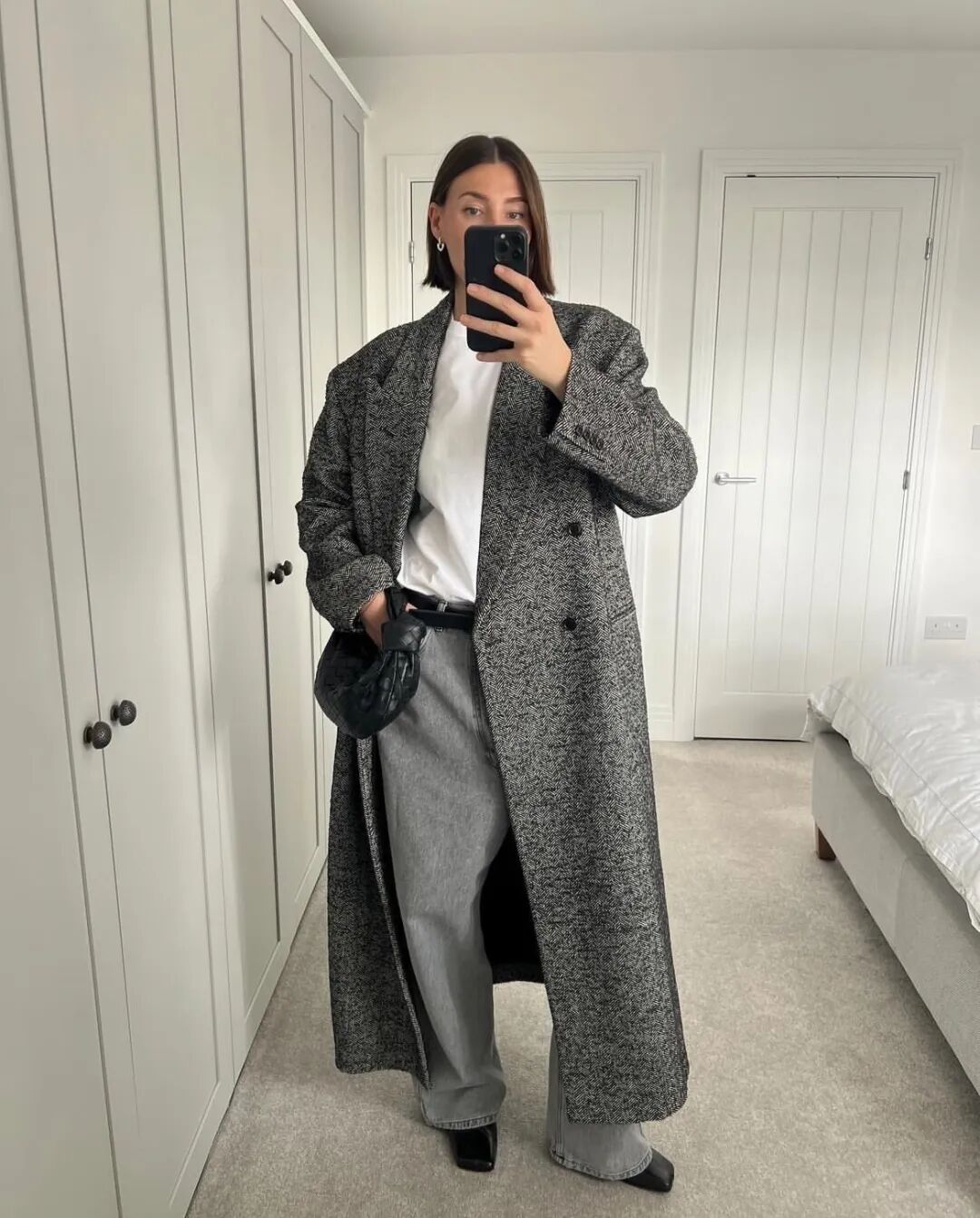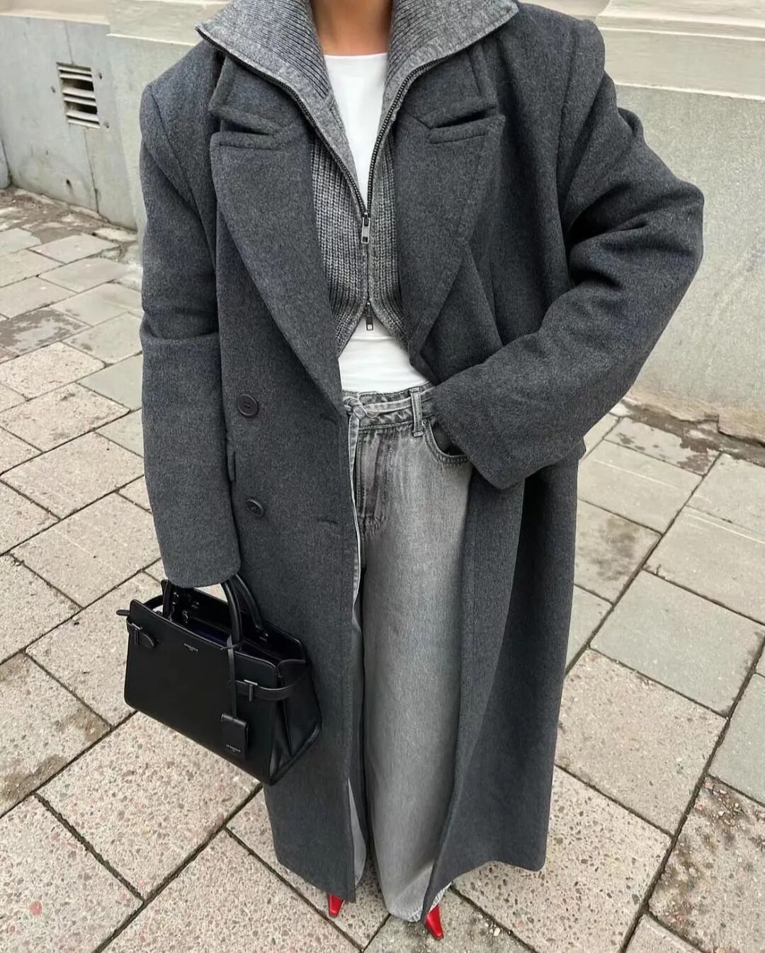 如果你觉得穿搭有些难度,那么一件能够盖住全身的灰色大衣就可以让你一件get格雷系穿搭,如果需要的话,也可搭配一条同色系的围巾或者其他配饰。就像在今年的无数街拍中,灰色大衣oversize亦是十分吸睛的存在——大气、简约、并且驾驭起来毫不费力,但一定要记住,内搭最好选择不会打乱大衣气场的黑白灰色效果会更好。