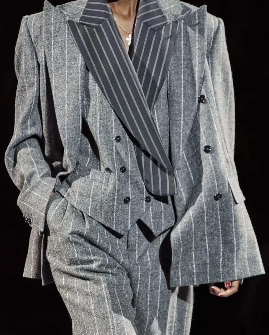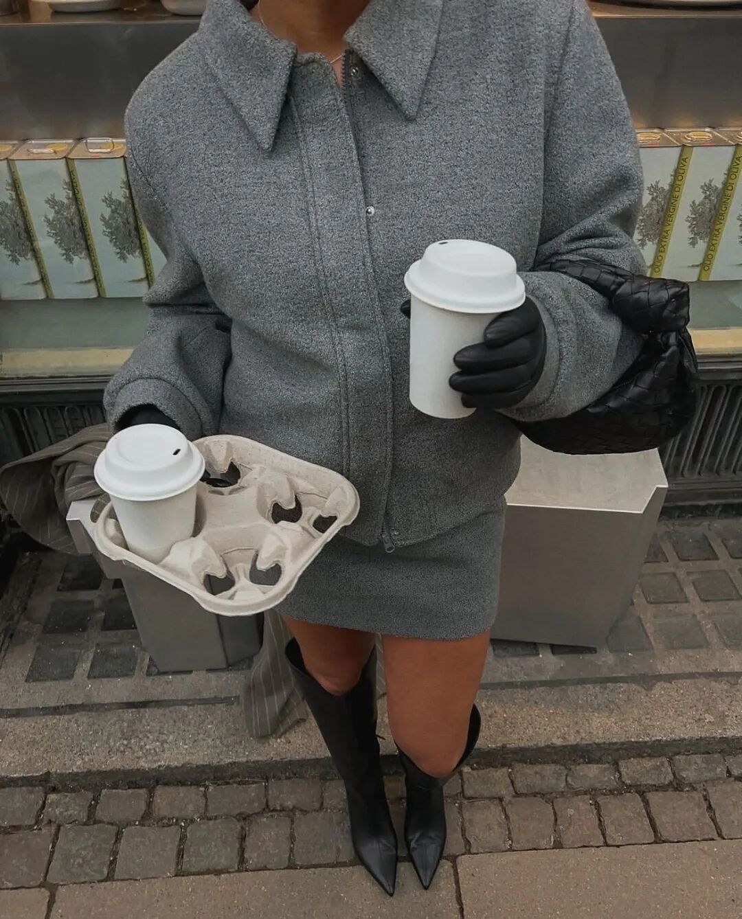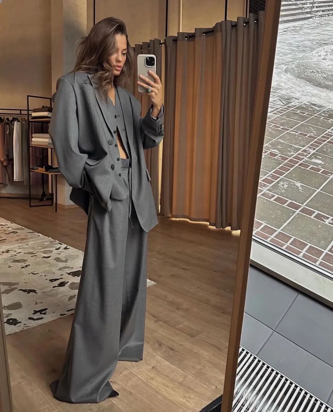 与上文中所提到的灰色大衣一样,同样是大面积的同色穿搭,但不同的是,这里是指两件至三件同色单品搭配的套装组合。那么在款式的选择上就要更加用心一些了,可以选择一些更具有设计感的单品,让少量且同色的服饰穿搭看起来没有那么得单调。与此同时,与从头到脚穿黑色不同,灰色能让你更好地看到细节,让中性色或主打单品更显高贵,这意味着你不会为了简单的搭配而牺牲风格。