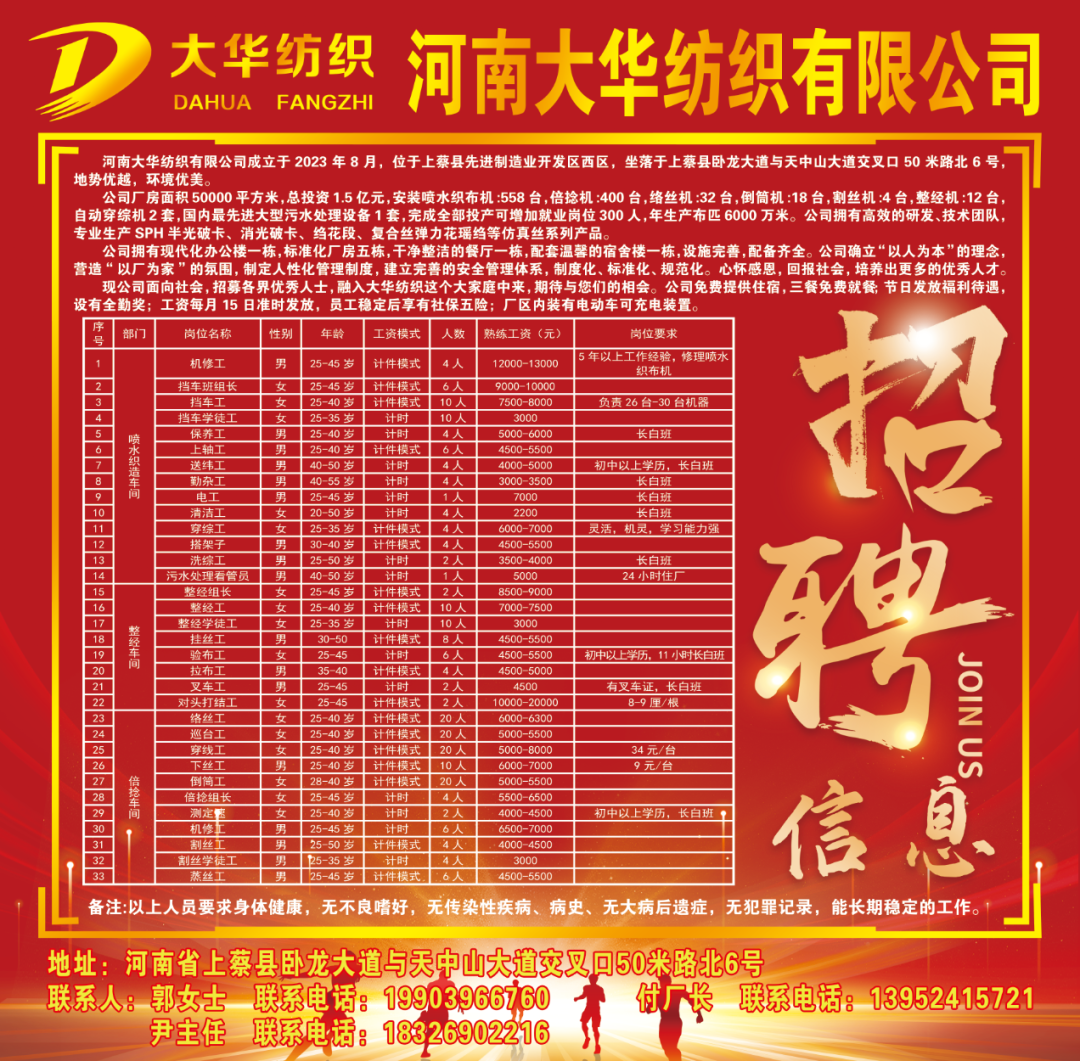 三餐免费,住宿免费,工资按时发放……河南大华纺织火热招聘中!