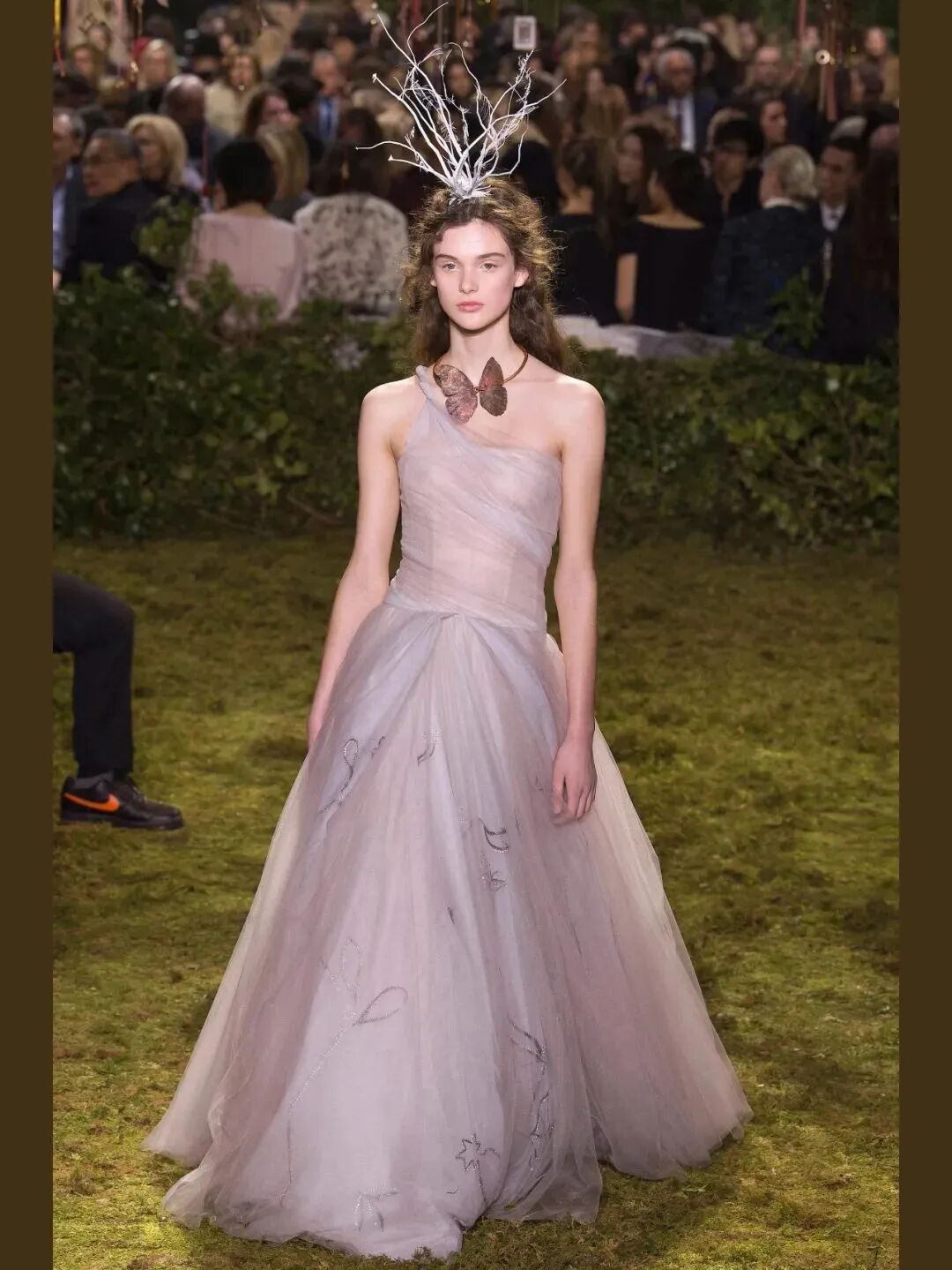 在绿野仙踪般的迷宫花园中,Dior举行了一场童话故事中的盛大舞会。“在黑暗中,我们将看到光明,在迷宫中,我们将找到笔直的道路。”大量的自然元素融入,蝴蝶在颈间翩翩起舞,模特们仿佛是缓缓走来的林中仙子。