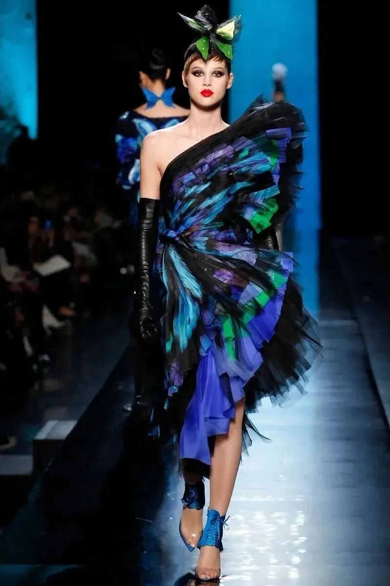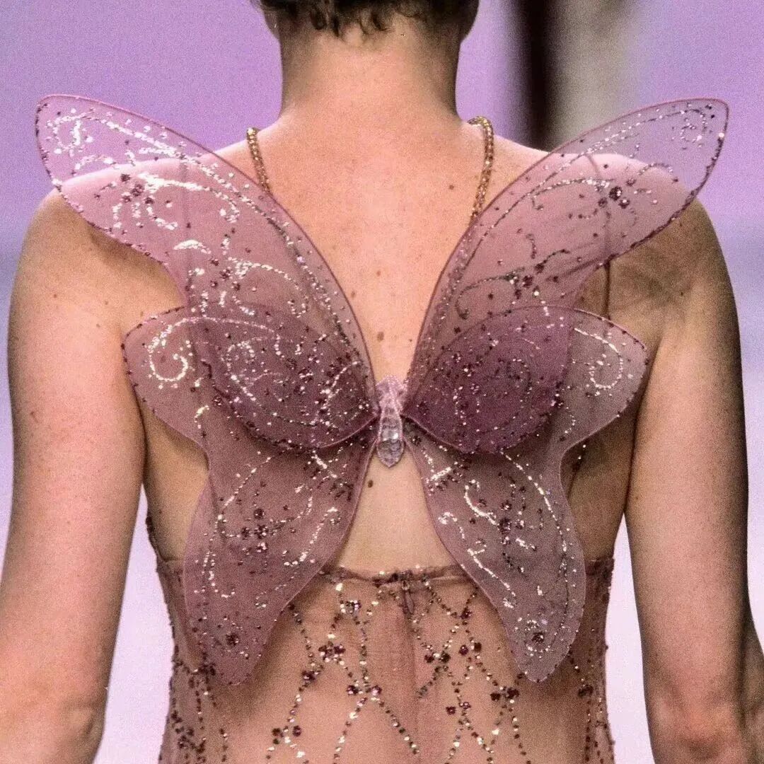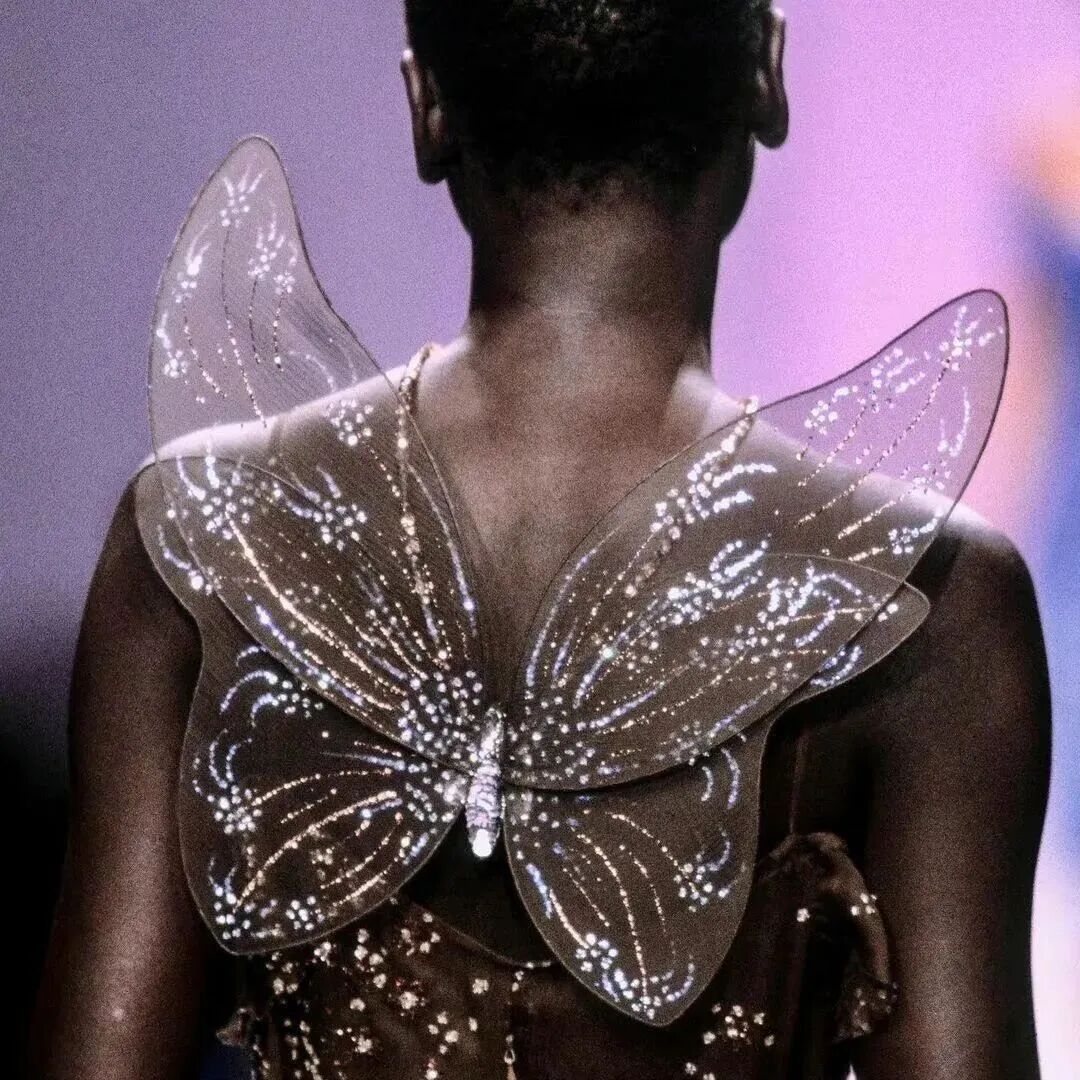 早在90年代,蝴蝶已经成为秀场上一道靓丽的风景线,秀场上的姑娘们化身暗夜精灵,蝴蝶翅膀带着她们轻盈飞行,脖间、发梢随处可见蝴蝶身影,身姿摇曳,流光溢彩。
