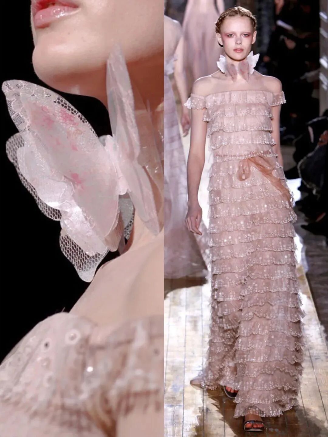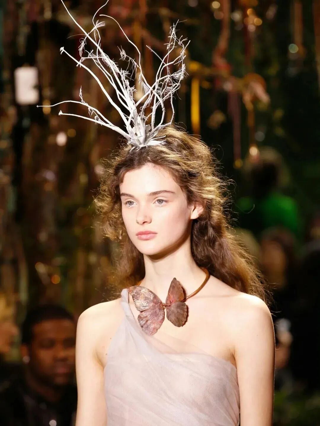 与其说它是时装秀场,不妨用蝴蝶博物馆来形容更加贴切,蝴蝶个个色彩斑斓,以多样姿态呈现在礼服与配饰上。由蝶翅色彩演化而来,模特的唇眸也不乏蝴蝶的色彩,让人迷醉其间。