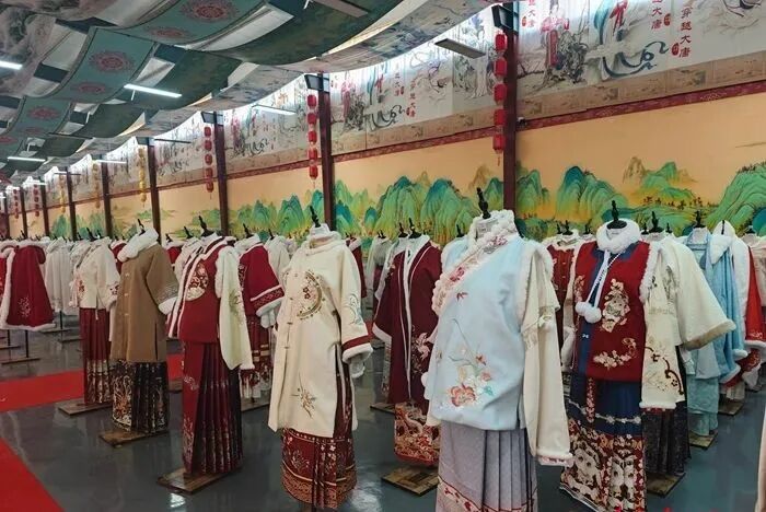 近日,来到曹县大集镇,发现沿街大小商铺中,各种款式的汉服拜年服琳琅满目,从华丽的长袍到精致的短打,应有尽有。在穿越大唐的展厅内,属于龙年的汉服拜年服单独成为一个展区,包括成人与小孩,其精致的刺绣在灯光的照射下熠熠闪光。