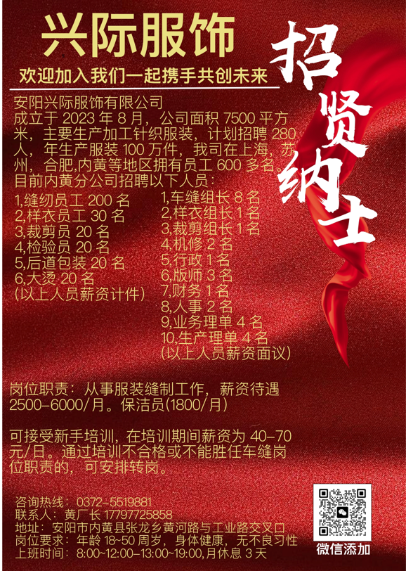 安阳兴际服饰有限公司成立于2023年8月,厂房面积7500平方米,位于内黄县张龙乡黄河路与工业路交叉口, 产品种类涵盖针织和梭织,运动休闲,棉衣羽绒服等。公司在上海、苏州、合肥等地拥有员工600多名,目前计划在内黄分公司招聘280人,包含缝纫工、样衣工、裁剪、后道等多个岗位。