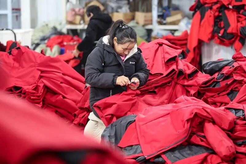 1月6日早晨,天边刚泛起鱼肚白的曙光,商丘市睢阳区冯桥镇吉航服饰的工人们便迎着朝霞,开始了一天的辛勤工作。走进工厂的生产车间,最先映入眼帘的是排放整齐的缝纫机和分块布局的服装半成品。在这里,裁剪、平车、包缝、封胶、钉扣、包装等工序一应俱全,工人们各司其职,整套流程有条不紊、一气呵成。