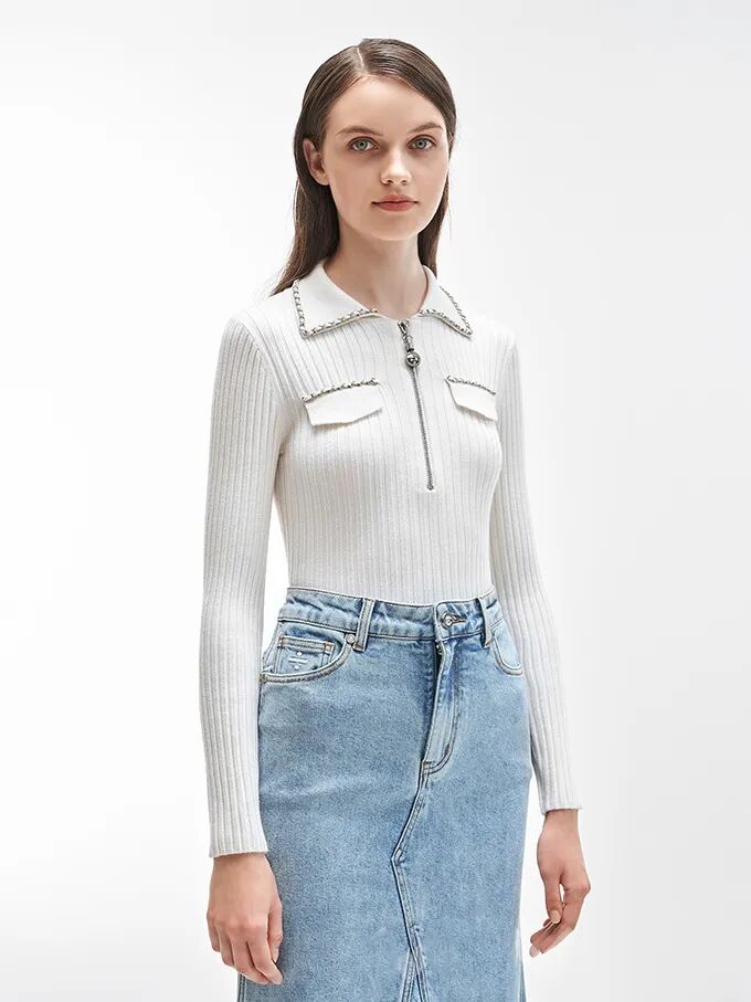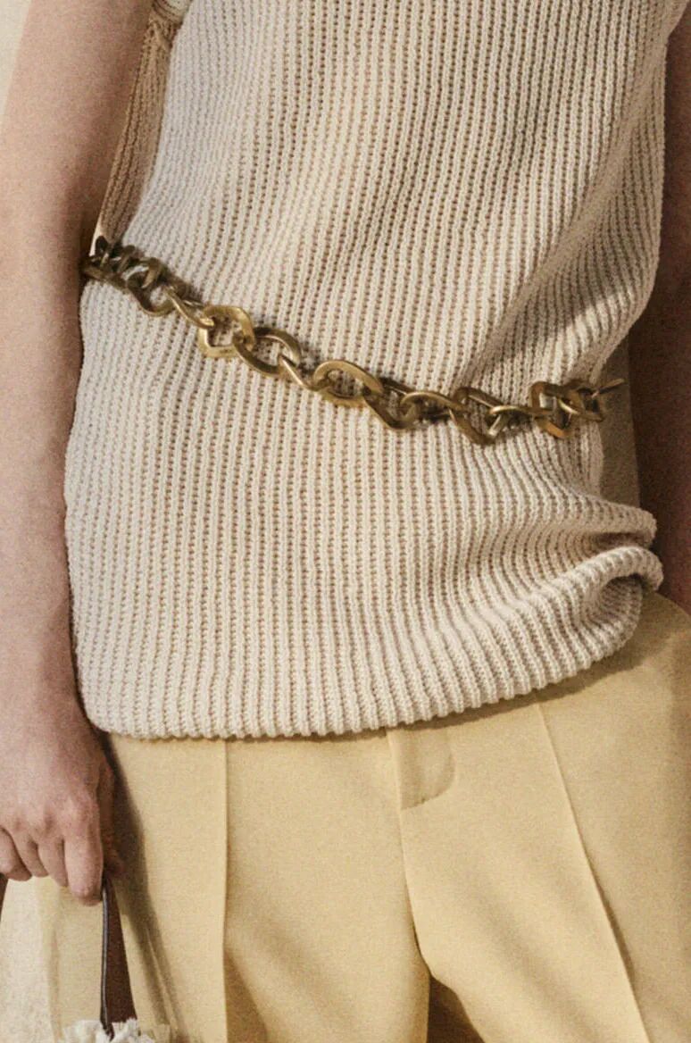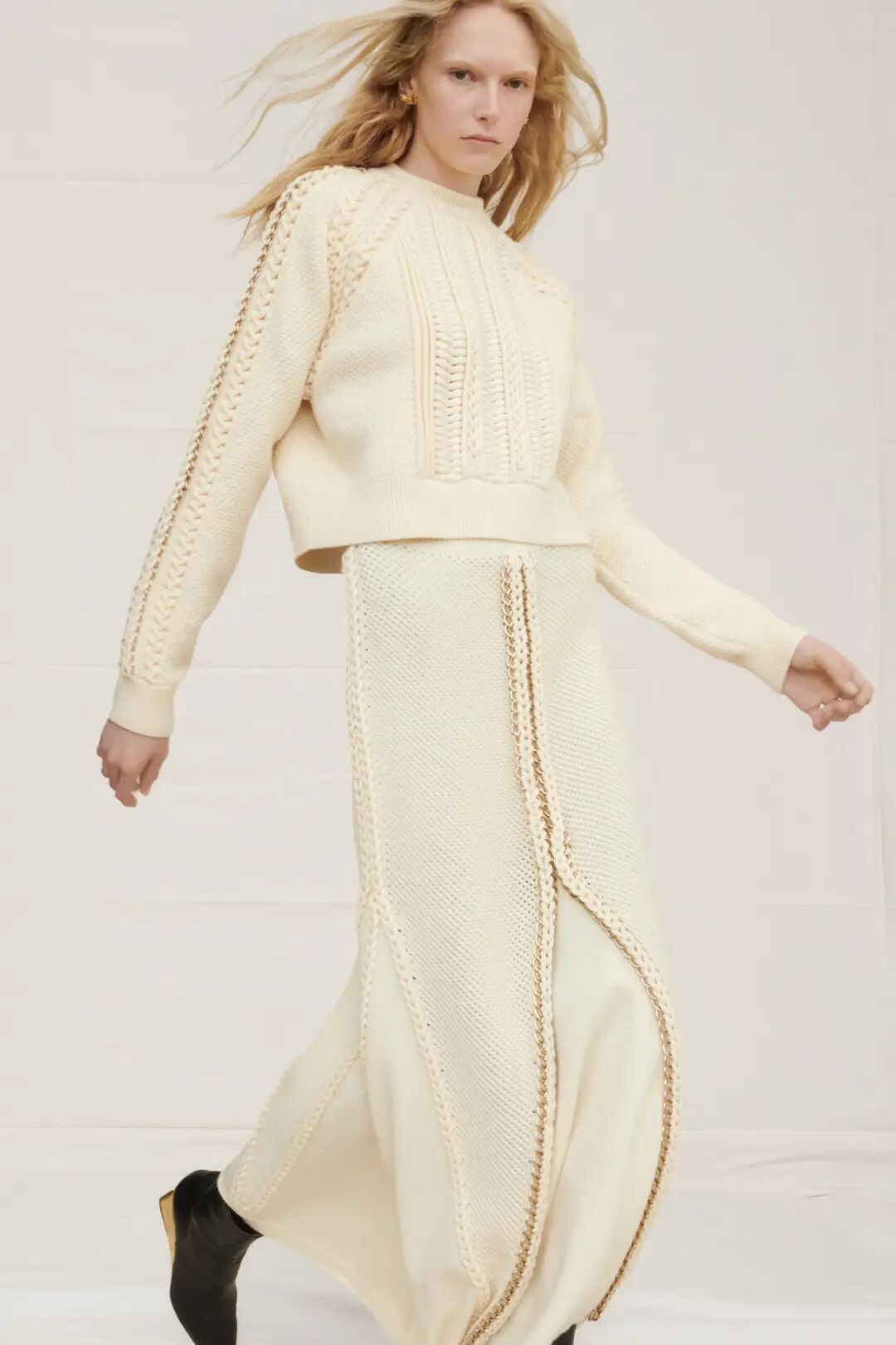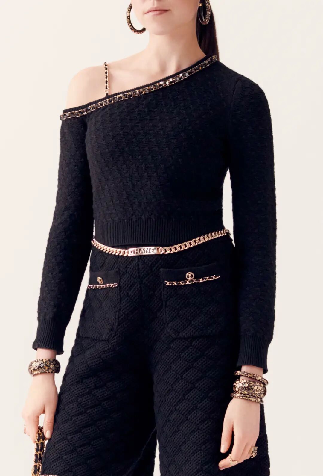 金属链条作为针织服装的装饰物件,自然的垂感为针织带来独特的延伸流动性,当穿着者走动起来,灵活的链条则给予整体灵动的气质。粗细与形态各异的链条与毛衫颈部、腰部、下摆、衣身处相结合,塑造着针织意想不到的状态与造型,从而达到不同的精彩装饰效果。