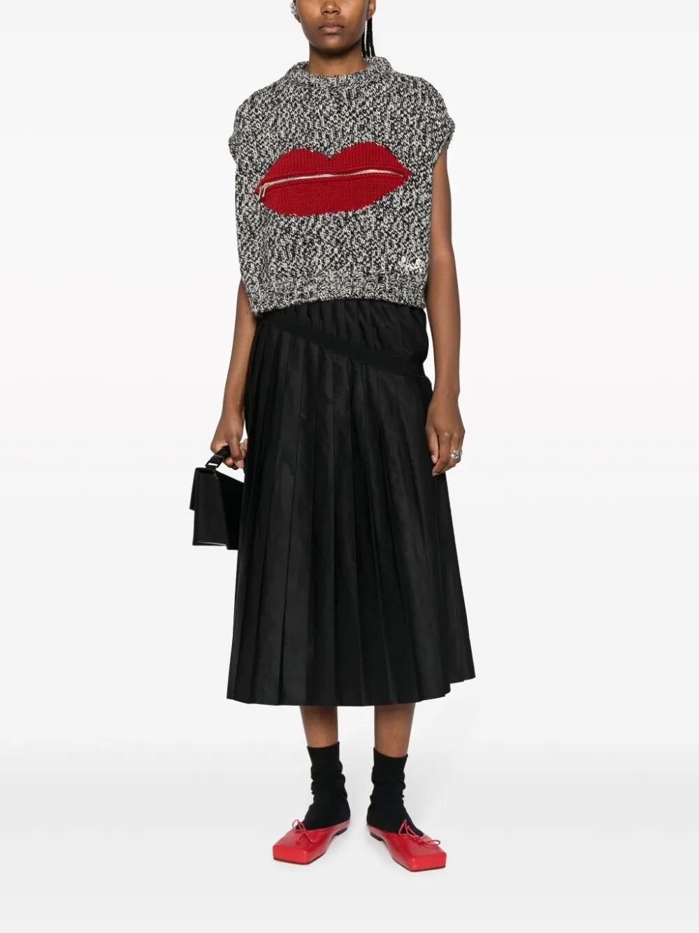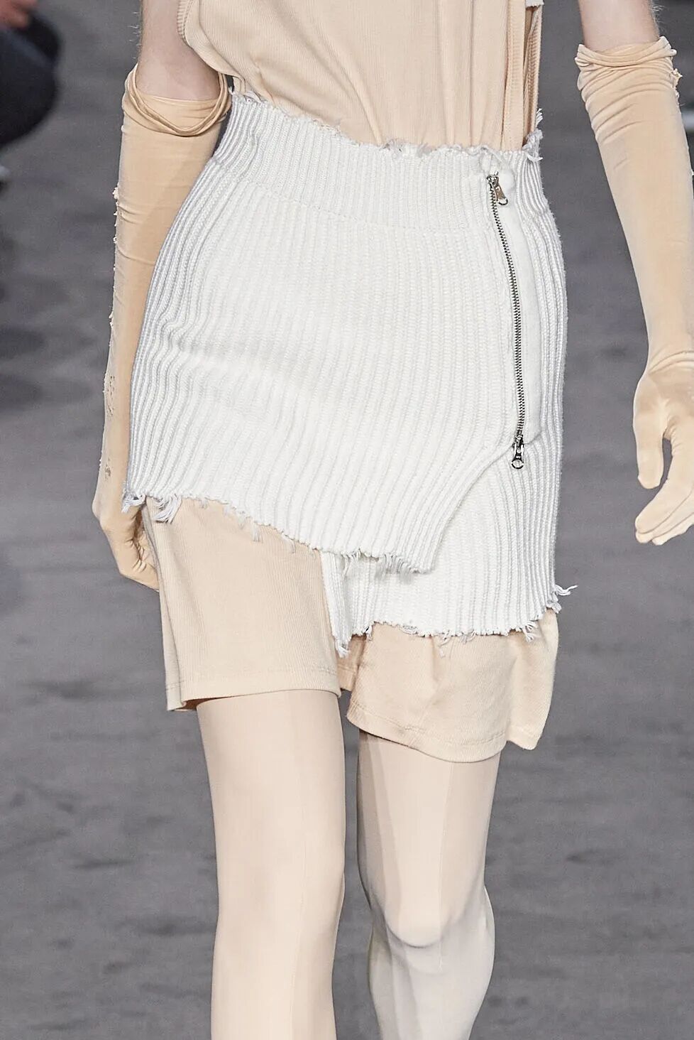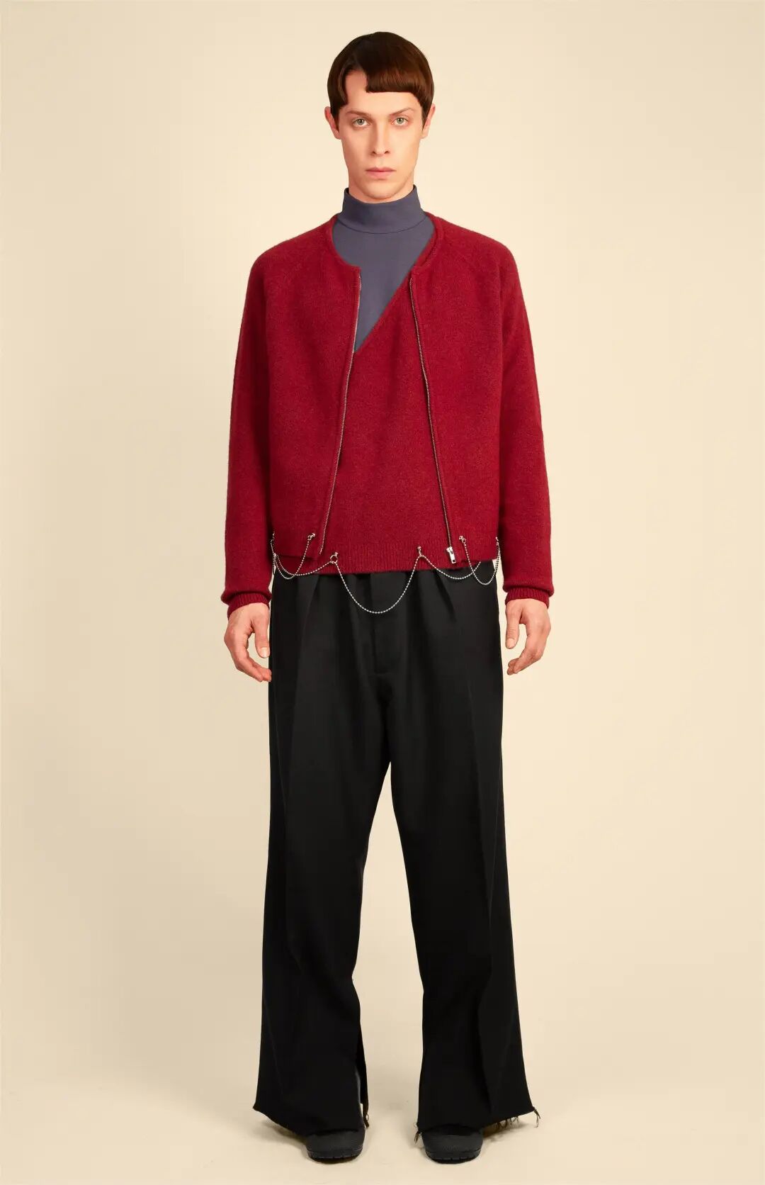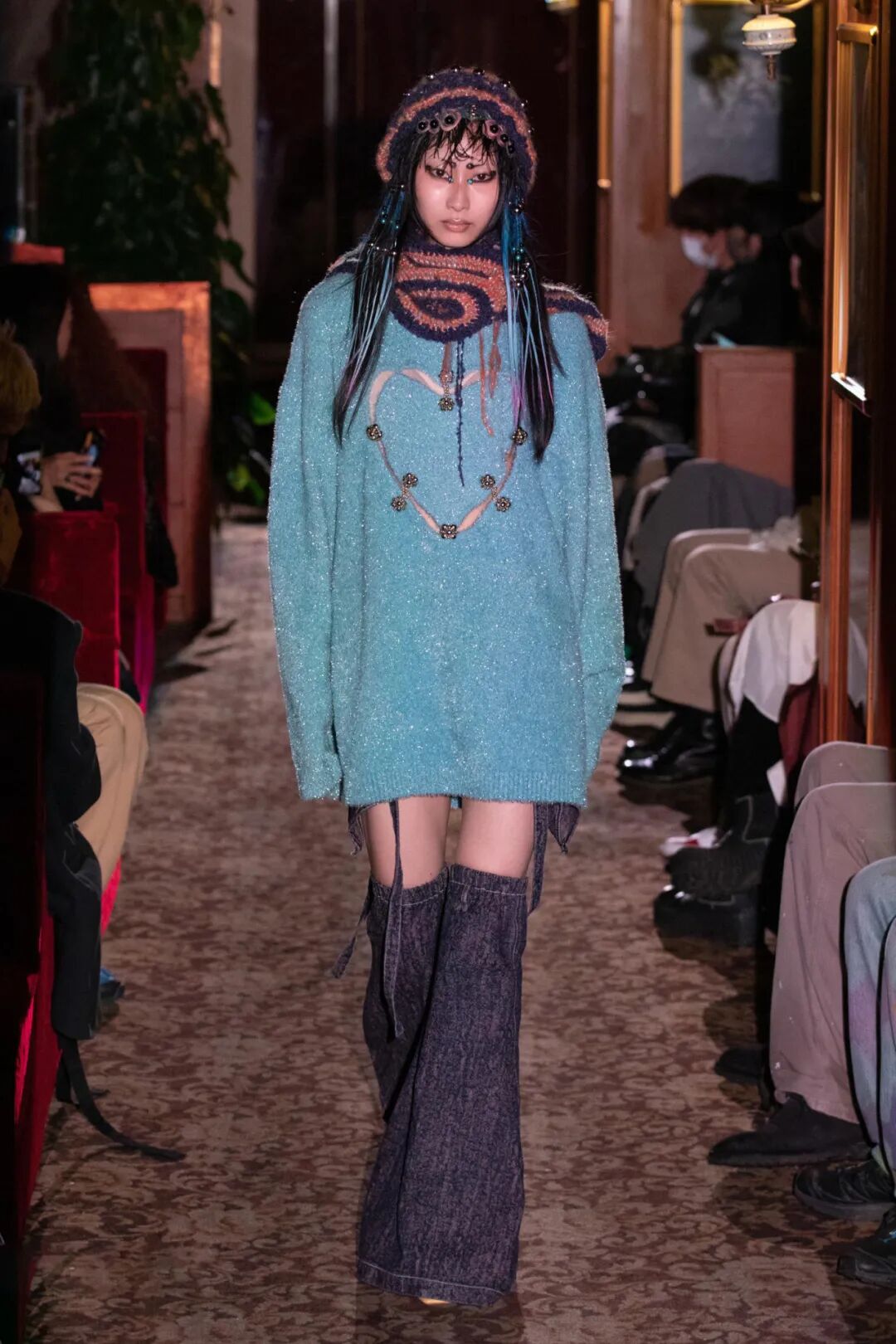 金属链条作为针织服装的装饰物件,自然的垂感为针织带来独特的延伸流动性,当穿着者走动起来,灵活的链条则给予整体灵动的气质。粗细与形态各异的链条与毛衫颈部、腰部、下摆、衣身处相结合,塑造着针织意想不到的状态与造型,从而达到不同的精彩装饰效果。