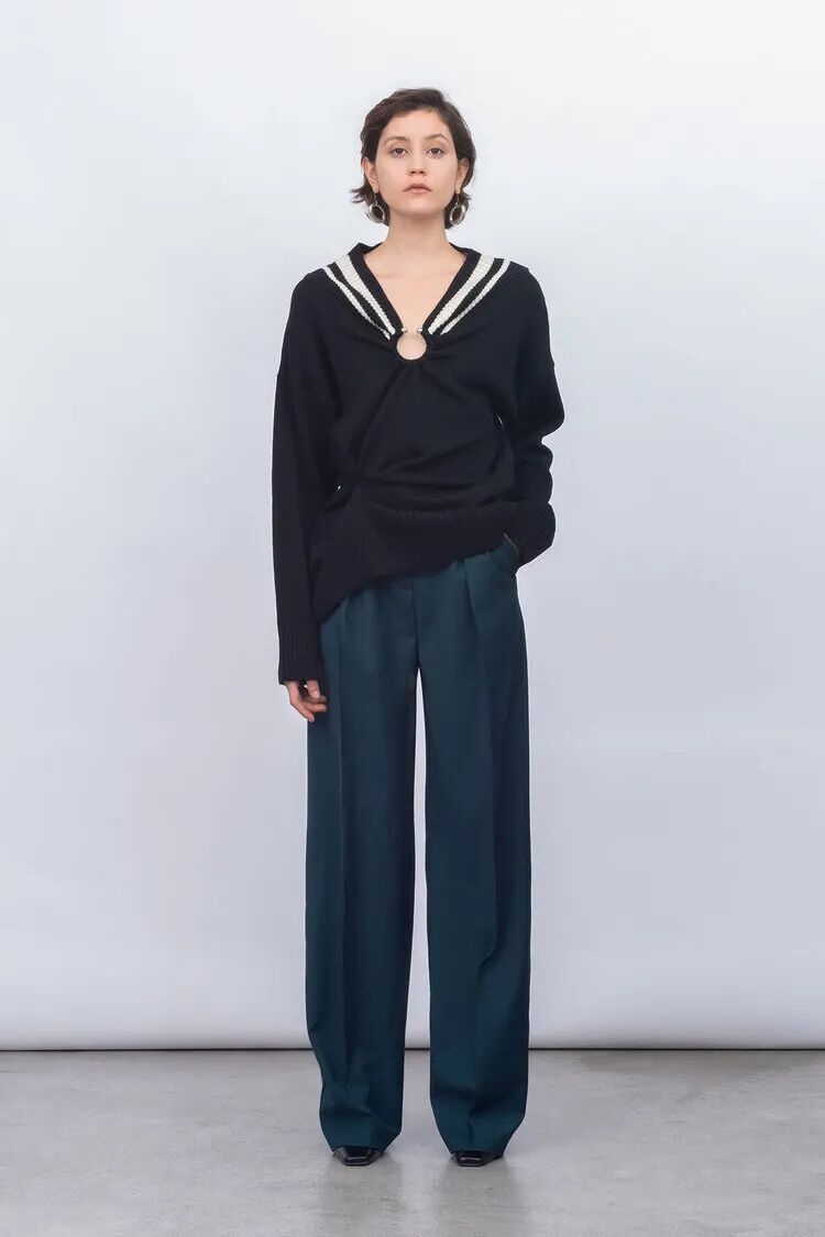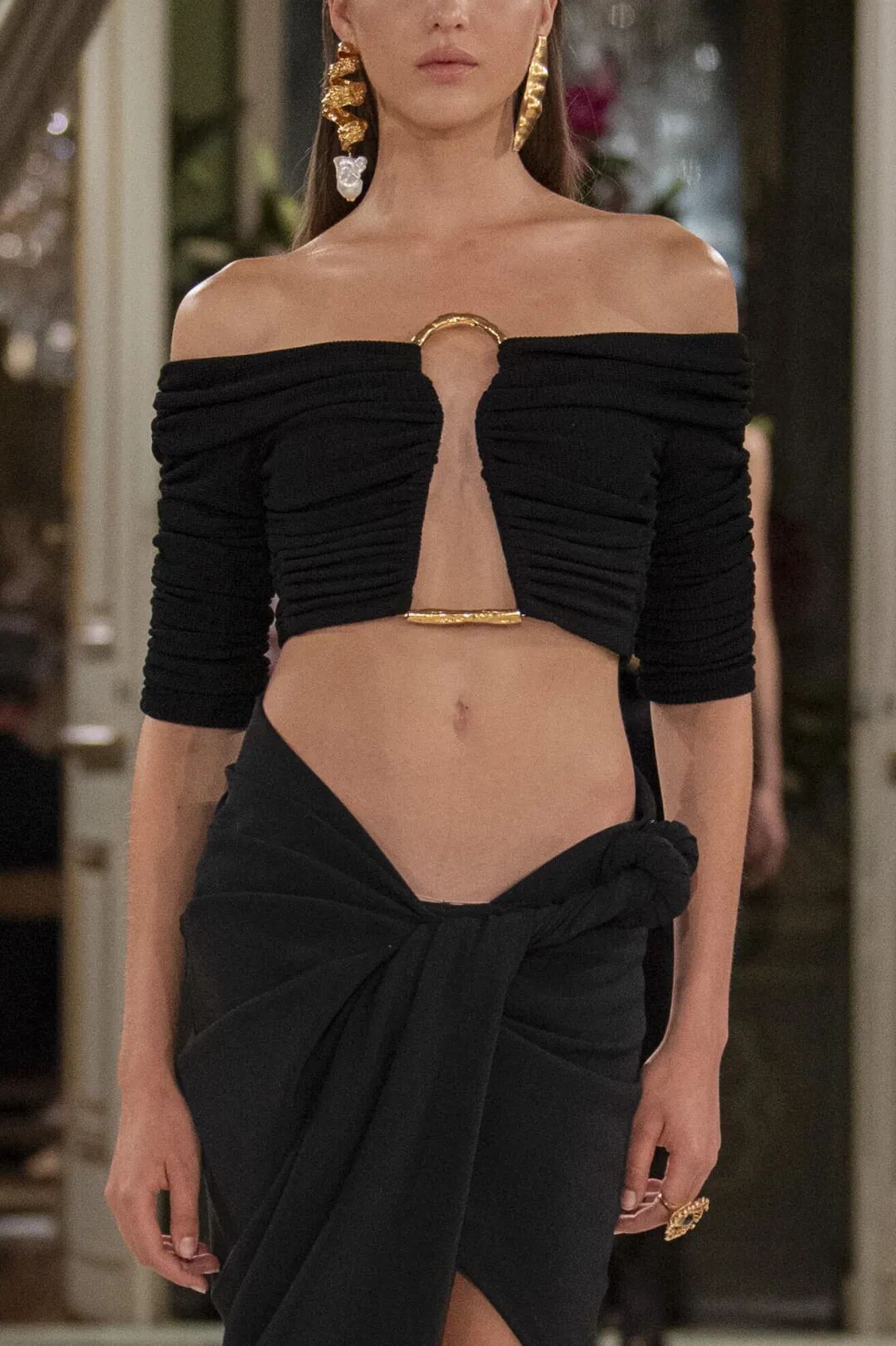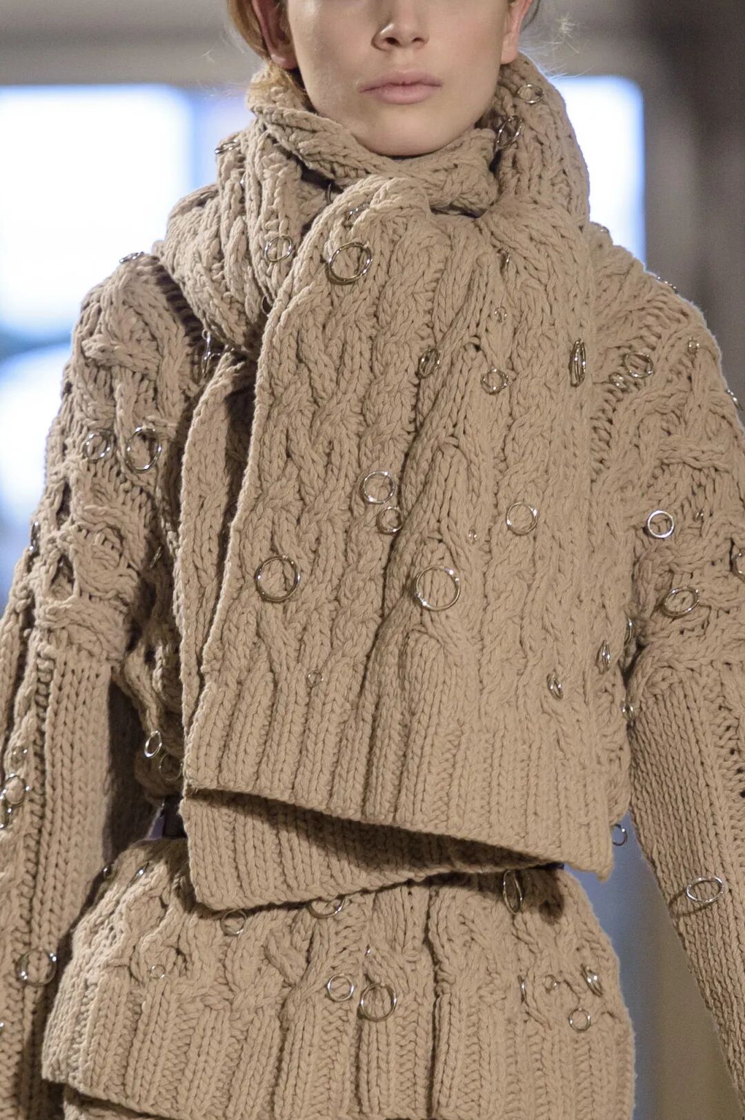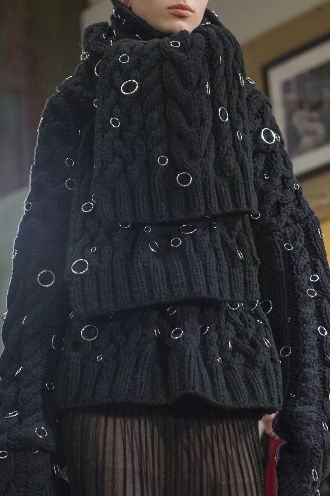 金属环状结构在针织服装中是个奇妙的部件,不但在视觉上快速抓住人的眼球,起着设计重心作用,同时将柔软的针织连接起来发挥着重要的桥梁作用。该结构常常应用在前襟、颈部、胸部、肩部等部位,大大丰富了针织的细节感,为整体增添一种前卫高级感。
