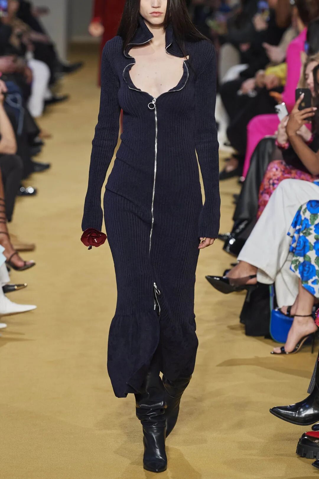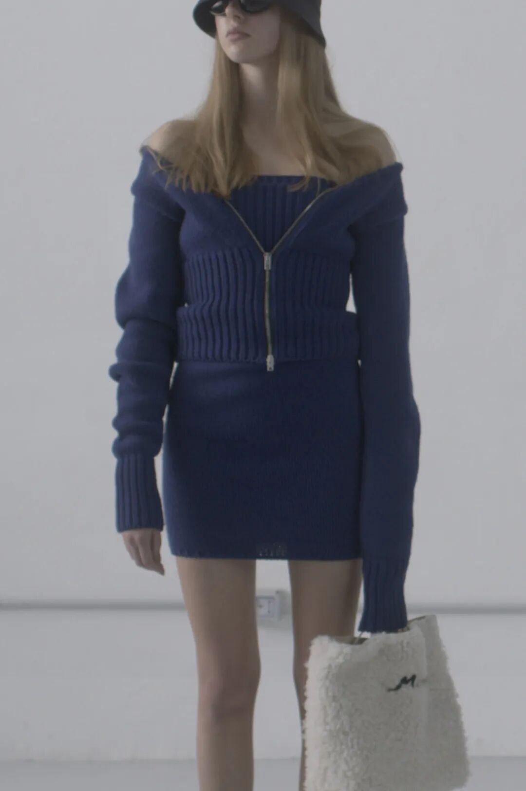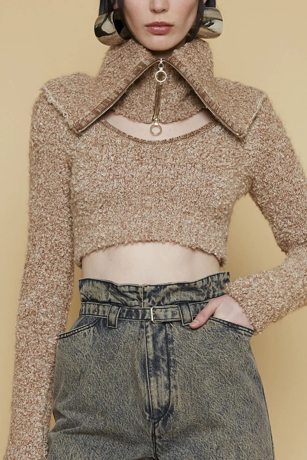 金属环状结构在针织服装中是个奇妙的部件,不但在视觉上快速抓住人的眼球,起着设计重心作用,同时将柔软的针织连接起来发挥着重要的桥梁作用。该结构常常应用在前襟、颈部、胸部、肩部等部位,大大丰富了针织的细节感,为整体增添一种前卫高级感。