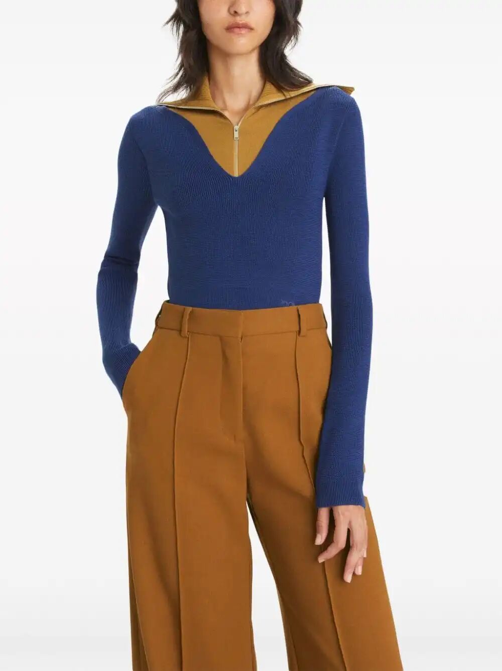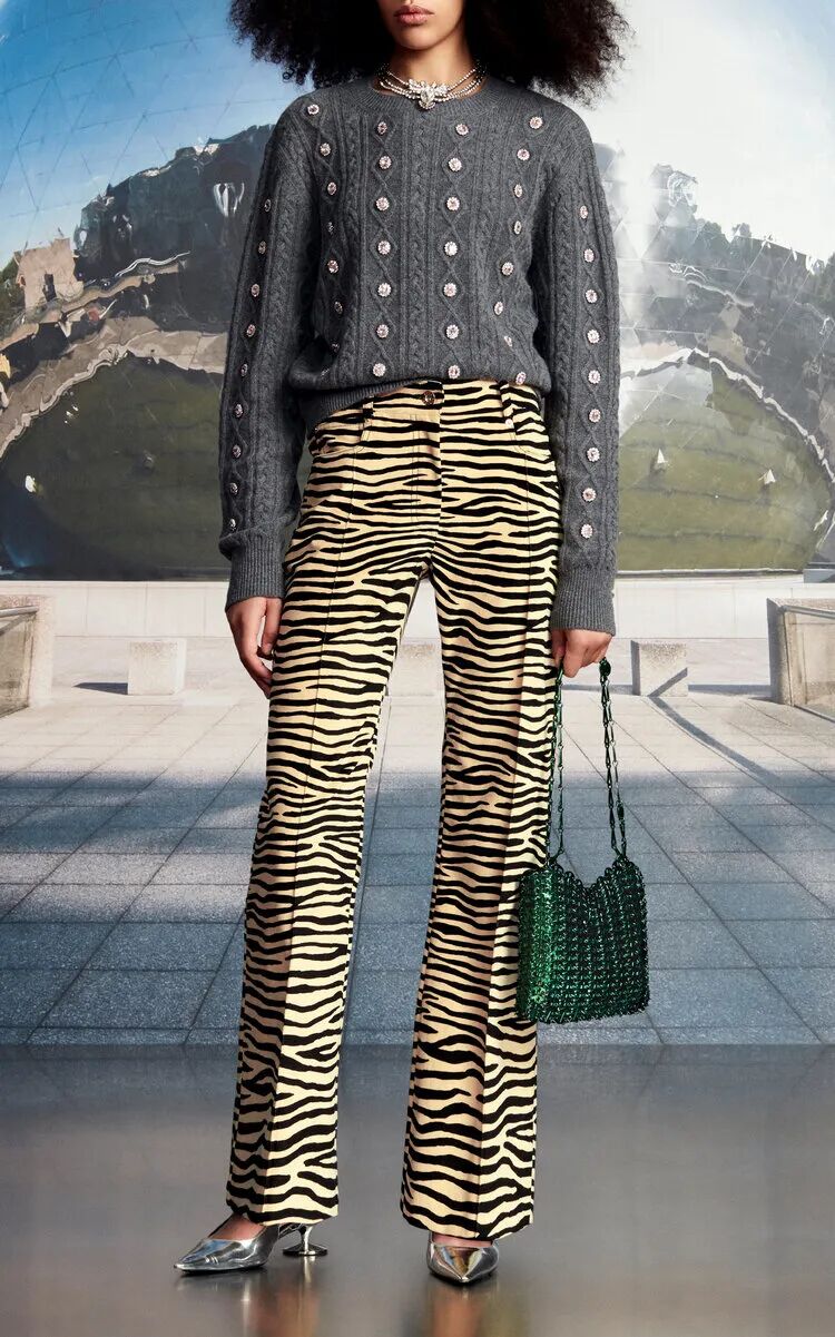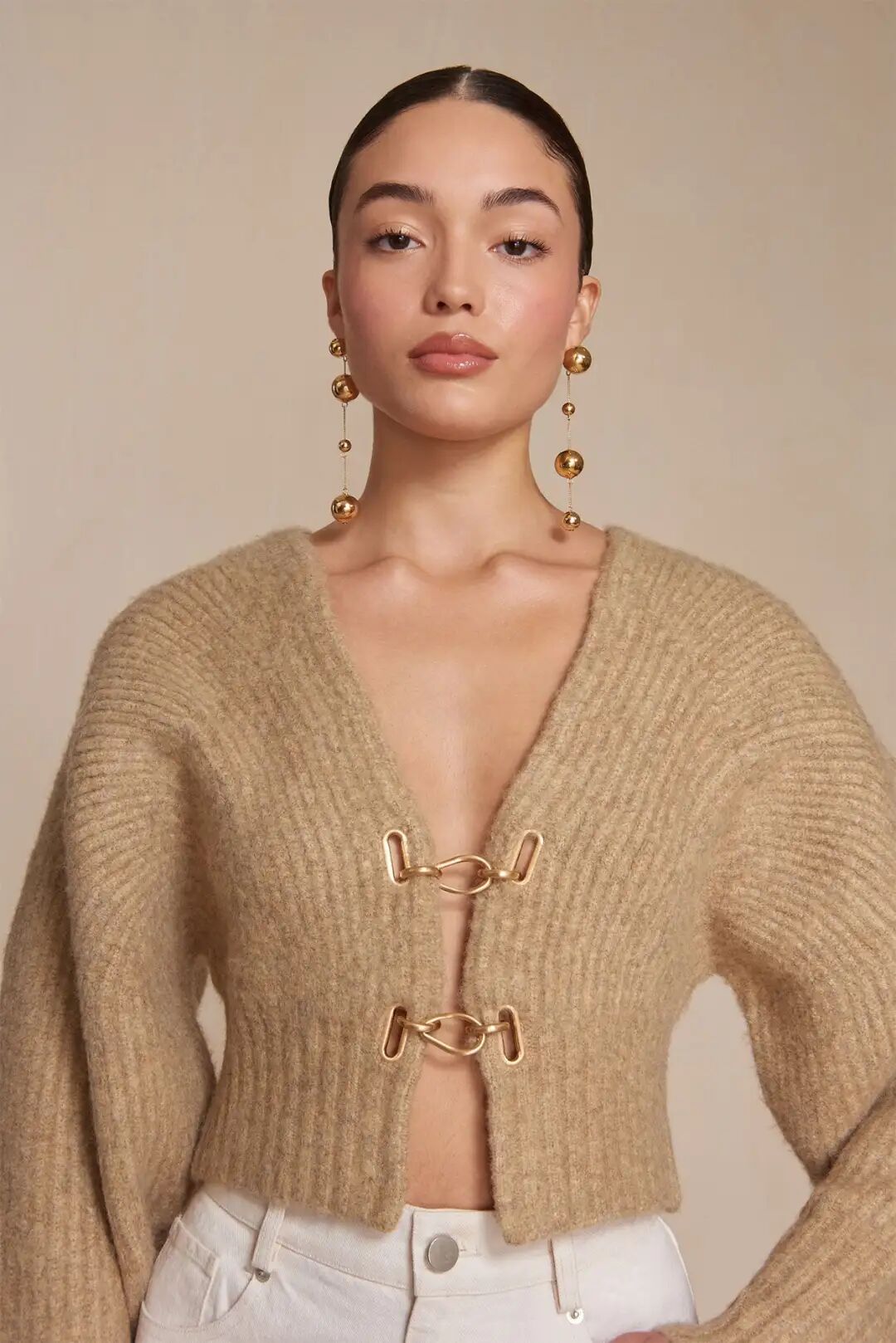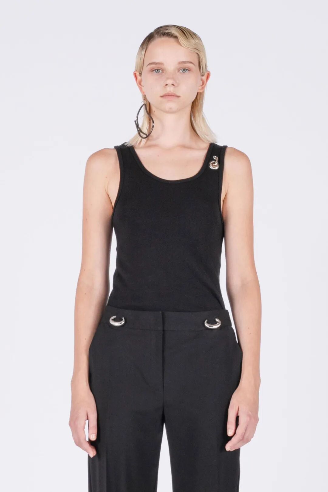 金属环状结构在针织服装中是个奇妙的部件,不但在视觉上快速抓住人的眼球,起着设计重心作用,同时将柔软的针织连接起来发挥着重要的桥梁作用。该结构常常应用在前襟、颈部、胸部、肩部等部位,大大丰富了针织的细节感,为整体增添一种前卫高级感。