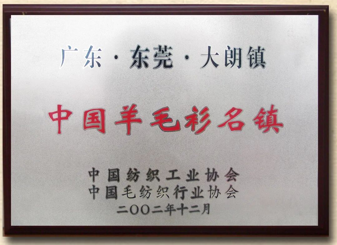 2002年,大朗镇被中国纺织工业联合会(原中国纺织工业协会)授予首批“中国羊毛衫名镇”称号,成为全国唯一的毛织服装流行趋势发布基地,并创办全国首个毛织服装设计大赛。