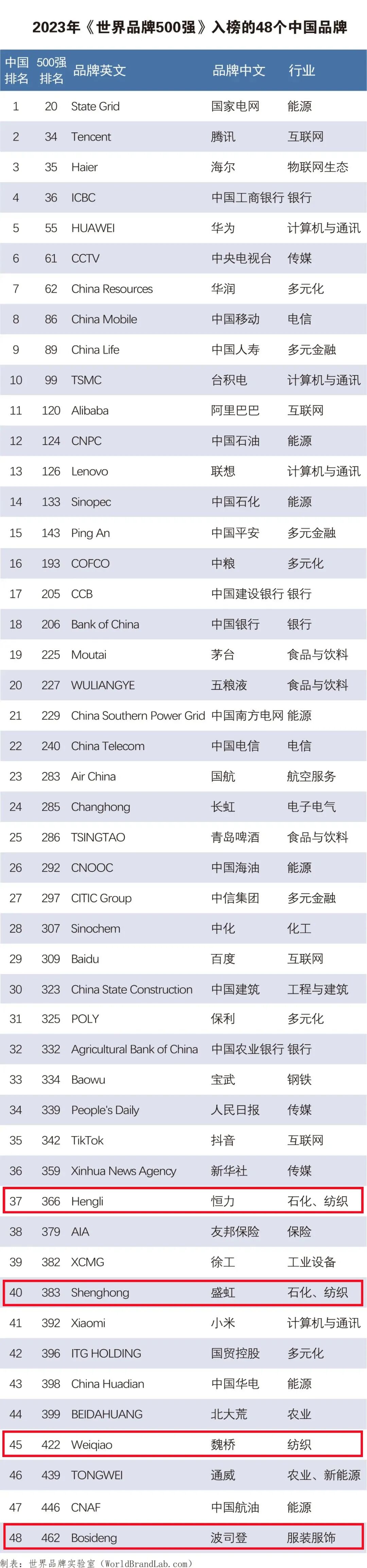 恒力品牌列第366位,这是“恒力”连续第六年度“世界品牌500强”排行榜,并被官方认定为“表现亮眼的中国品牌”之一。多年来,“恒力”品牌凭借持续成长的企业规模、突出的行业贡献和社会贡献,赢得了世界和专家的一致认可。“恒力”品牌2018年首次上榜“世界品牌500强”列第436位,这六年来,“恒力”排名累计上升70位,充分展现了“恒力”的品牌影响力、市场占有率、品牌忠诚度和全球领导力正在持续提升。据介绍,立足实体经济、深耕优势产业,努力打造全球行业新标杆,是恒力的战略定位。接下来,面对品牌的全球化竞争,“恒力”将继续坚守初心、守正创新,积极探索品牌多元化发展,打造品牌特色,提升品牌竞争力,坚定不移向着“世界一流品牌”的目标迈进。盛虹位列世界品牌500强第383位,较去年提升了5位。据悉,盛虹于2021年首次进入世界品牌500强,排名第399位。2022年,盛虹再次入选世界品牌500强榜单,排名第388位。作为行业领军企业,盛虹以“为行业高质量发展探路”的高度责任感,聚焦“新能源 、高性能新材料、低碳绿色”三大方向,以原创性引领性科技创新,攻克了诸多关键核心技术,引领行业高质量发展;成功研发打破国外垄断、填补国内空白的光伏级EVA,目前产能达30万吨/年;成功完成POE中试,实现POE催化剂及全套生产技术完全自主化,成为国内唯一同时具备光伏级EVA和POE两种主流光伏膜材料自主生产技术的企业。另一方面,着眼国内市场需求及助力实现“双碳”目标,盛虹积极探索绿色发展新路径,创新打造绿色负碳产业链。盛虹石化二氧化碳制绿色甲醇装置采用国际先进的ETL专利技术,设计主动吸收二氧化碳规模15万吨/年,可转化为10万吨/年绿色甲醇,进而用于生产绿色高端新材料。在降低碳排放、改善生态环境以及延伸绿色产业链上,具有积极意义和显著标杆效应。据介绍,未来盛虹将始终坚持发展实体经济,扎根高质量发展,依靠科技创新和绿色工艺,进一步延伸产业链,做“全”做“优”产业源头,做“特”做“高”下游产品,努力成为高质量发展的引领者、产业转型升级的探路者。魏桥在本次世界品牌500强中位列第422位,比去年上升了20位,这是魏桥创业集团连续第5年上榜世界品牌500强。魏桥创业集团自2019年首次跻身世界品牌500强,成为世界企业500强和世界品牌500强双500强企业,至今已连续五年入选该榜单。据介绍,未来魏桥创业集团将继续提升品牌管理能力,抓好品牌建设,坚持以匠心铸精品,以质量树品牌,进一步提升“魏桥”牌产品的市场竞争力和影响力,积极创建世界名牌,致力打造“品牌魏桥”,全力创建基业长青的百年制造企业。作为国内羽绒服的领军品牌,波司登专注羽绒服领域47年,致力于推动羽绒服从单一保暖功能向科技化、时装化、绿色化变革,为国内外消费者提供更专业、更科技的羽绒服产品。波司登定位“全球领先的羽绒服专家”品牌,品牌认知深入人心,通过科技创新与消费者建立温暖连接,品牌第一提及率、净推荐值、美誉度等稳居行业第一,波司登羽绒服畅销美国、法国、意大利等72个国家。近年来,波司登的业绩节节攀高,品牌广受市场与消费者的认可。不仅仅是靠其表现出的亮眼业绩,同时也包括品牌在产品方面强大的研发和创新能力。基于匠心打磨的创新设计与专利科技,波司登构建了年轻化、国际化、多样化的产品矩阵,包含轻薄羽绒服、舒适户外等创新系列,更首创了风衣羽绒服这一全新品类,屡获国际殊荣与设计大奖。此外,通过参展纽约时装周、米兰时装周、伦敦时装周,参加中国品牌日等重量级品牌活动等,波司登持续筑高品牌势能,书写了新时代国货品牌崛起的高分答卷。截至目前,波司登已蝉联中国市场羽绒服品类销量冠军28年,全球羽绒服规模领先。