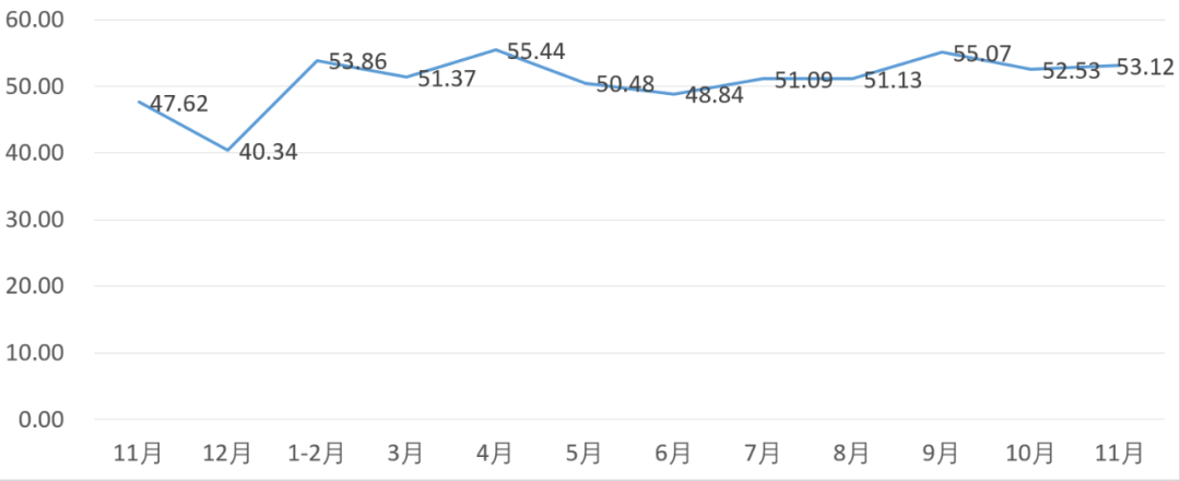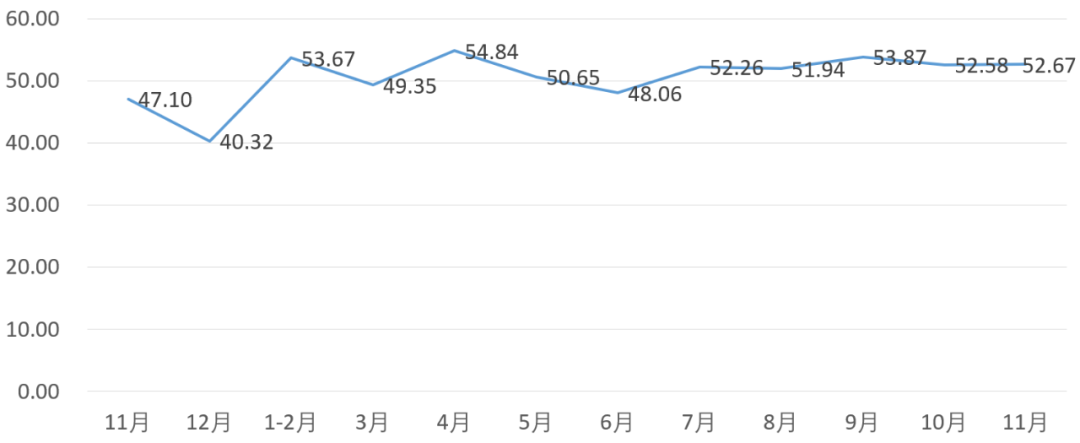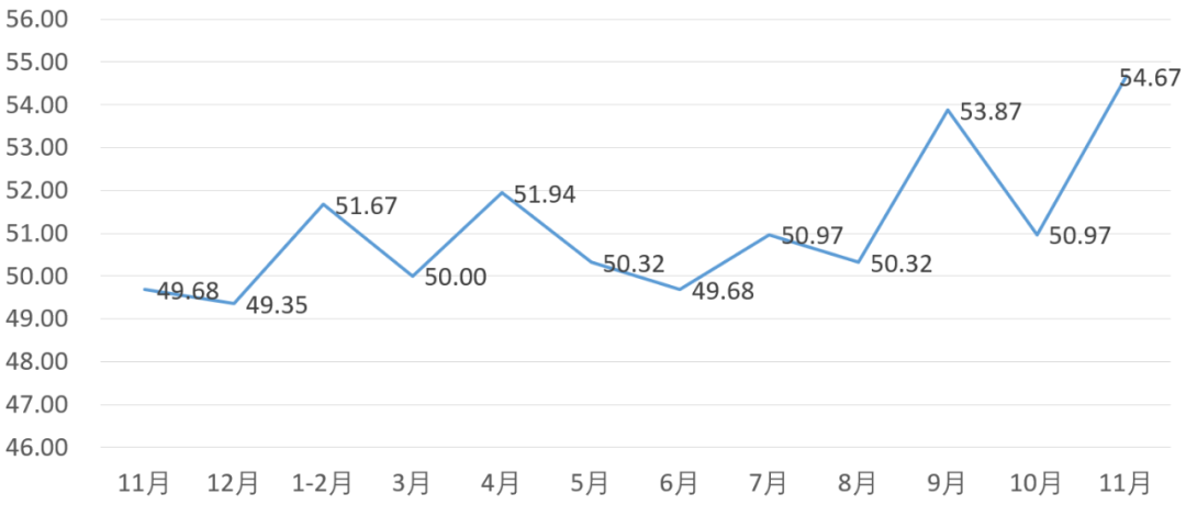 从管理者景气指数来看,总指数中,11月管理者景气指数为52.17,比10月的52.26下降0.09个百分点;经营环境指数为52.33,比10月的53.23下降0.90个百分点。