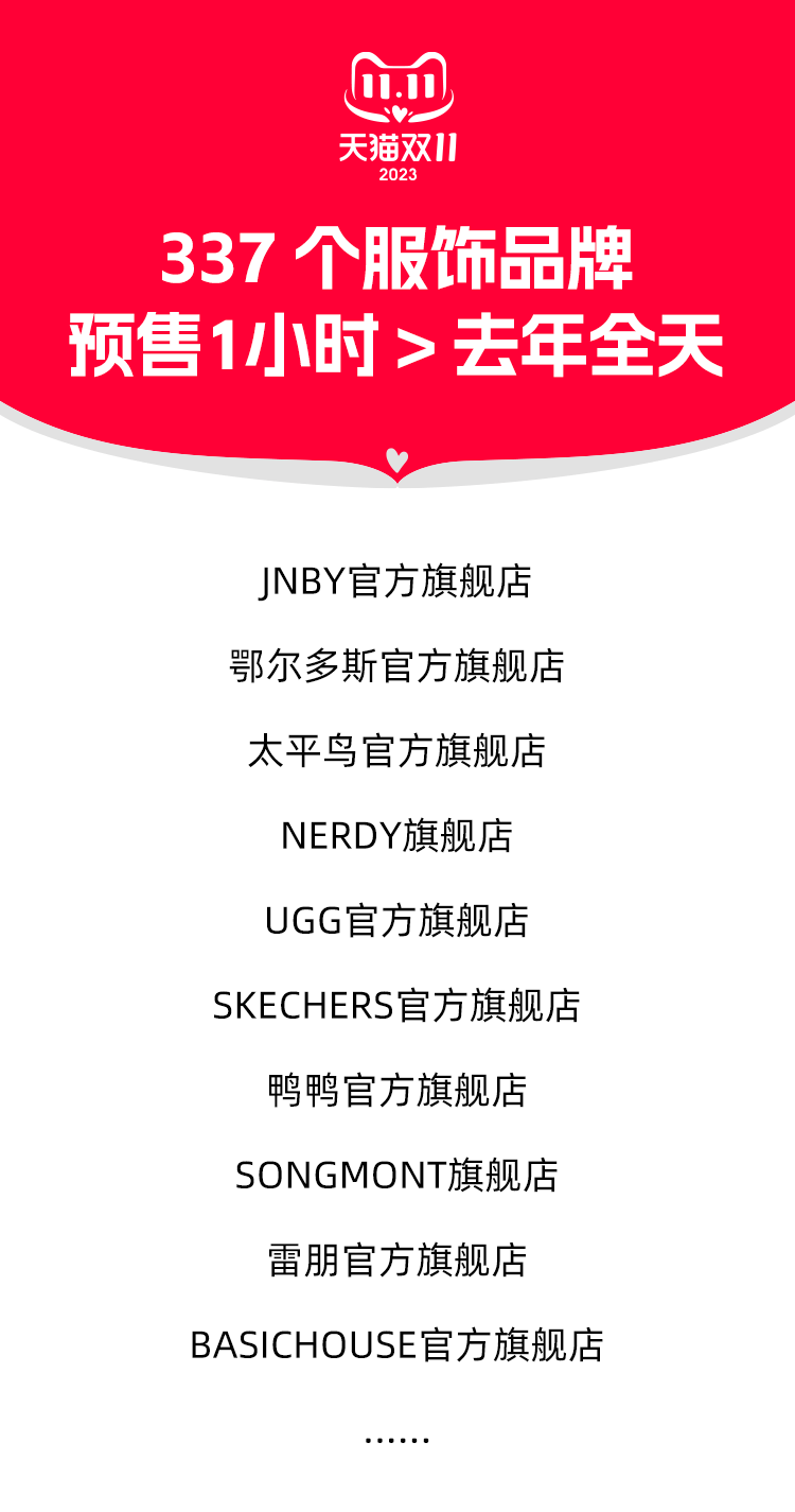 10月24日晚8点,天猫双11预售开启,服饰行业爆发式增长,337个品牌预售1小时超去年全天。
