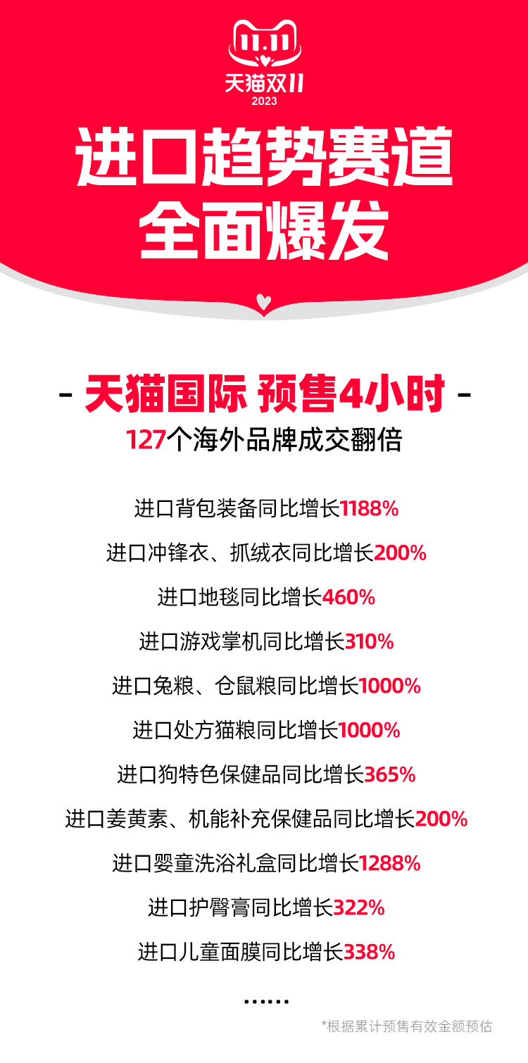 另外,海外品牌成交同样爆发,4小时内,天猫国际127个海外品牌成交同比翻倍。