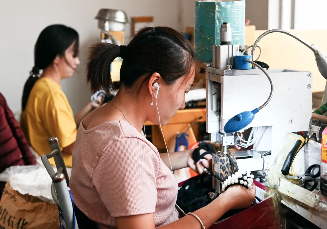 近日,走进坞头村北头的祺雅头饰厂区看到,一排排生产车间鳞次栉比、机声隆隆,不时有工人在多台机器间巡回查看,更多的工人则在进行打珠、包装等,一包包打好包的皮筋头饰堆在车间门口等待运往全国各地批发市场,一辆辆物流收货车往来穿梭搬运货物……忙碌、有序,处处彰显着“皮筋帝国”的风采。
