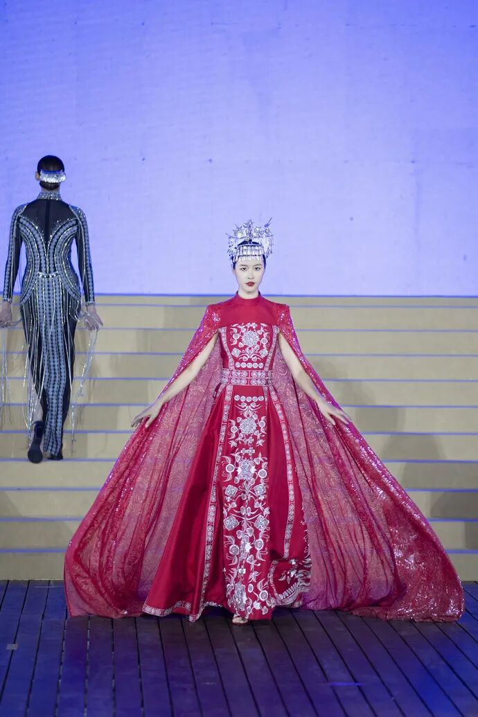 来自海南东方、云南绥江、内蒙古锡林郭勒盟、贵州黔西南的“绣娘”齐聚拥有厚重历史文化的郑州,在聚光灯下娓娓道来自己依靠手艺改变生活实现梦想的绣梦故事。高定华服正是融合了苗绣、锡锈、钉珠绣等传统手工艺,将沉淀千年的民族美学与现代时尚品格碰撞融合,折射出多彩的国潮文化与民族艺术,蕴藏在绣品上璀璨的历史文明拥有了最鲜活的表达和最生动的注脚。