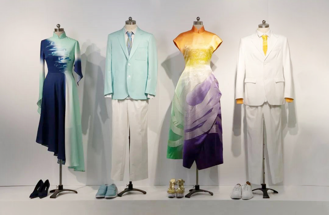 在金牌颁奖的高光时刻,中国风时尚元素尤为突出。亚运会颁奖礼仪服装“云舒霞卷”出现在每一次颁奖仪式上,每次亮相都能惊艳世人。这套服装采用国风设计+渐变配色+传统工艺,中式旗袍襟口结合西式开衩裙摆,配以亚运色彩“虹韵紫、月桂黄、水墨白、湖山绿”,上部分是从“西湖时代”走向“钱江时代”的手绘图景,下部分汇聚了象征着钱塘江、城市交通及竞技赛道的波浪形图案,版型风格中西兼容,体现大国礼服的风范与东方韵味的独特。