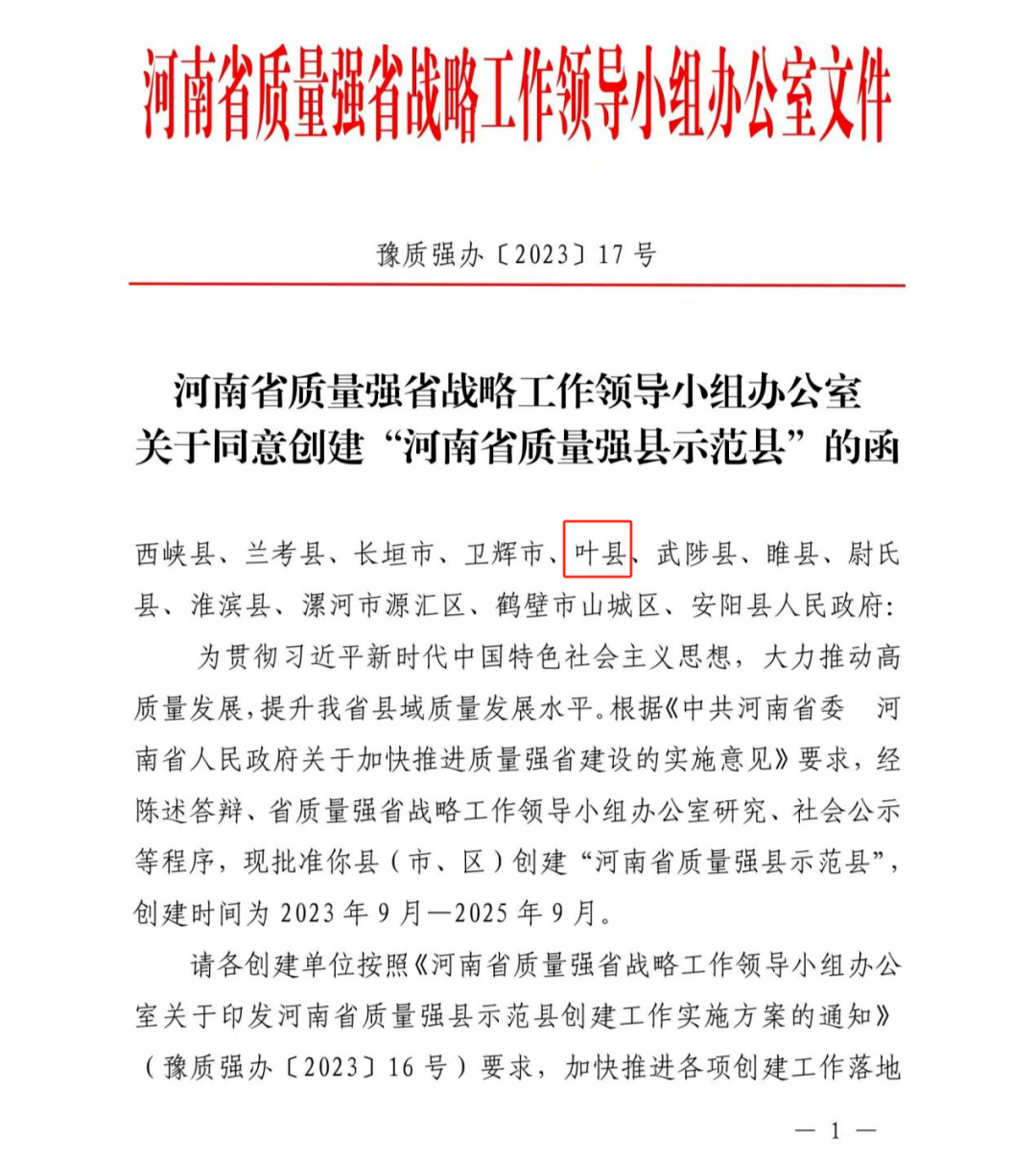 近日,《河南省质量强省战略工作领导小组办公室关于同意创建“河南省质量强县示范县”的函》印发,同意全省12个县(区)创建“河南省质量强县示范县”,叶县名列其中。