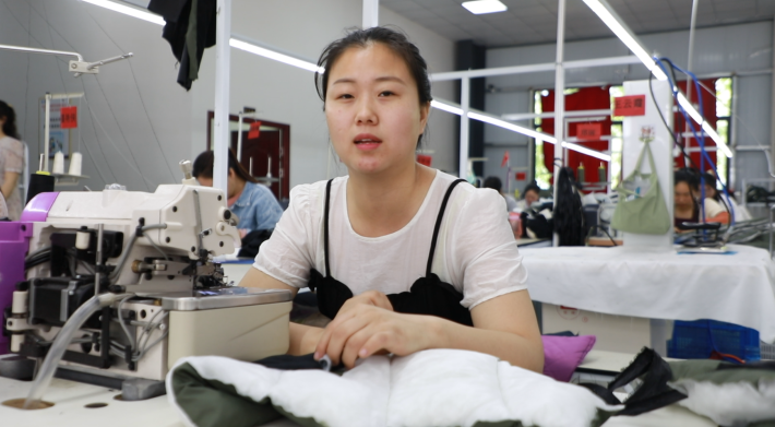 “我以前在无锡上班,但是不能照顾家中的小孩很不方便。回家过春节时听说国机集团在家乡投资建设了服装厂,就报着试试干的想法,现在已经做了两三个月了,感觉工资福利等各方面待遇还可以,接送小孩儿时间也自由,也能照顾点家里”淮滨苏美达第五振兴车间员工付萌萌说。