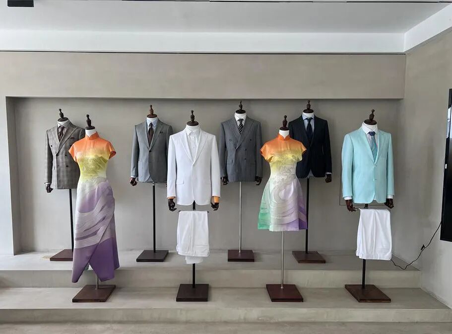 如何把这一宏伟的构思落地生产为精美礼服?博亚服饰在面料运用、量体、剪裁等各个环节都下足功夫,层层淬炼、精心打磨。“礼服面料是以专项专定的真丝与人丝交织的纱线形成吸湿、透气、舒适等功能,以高科技术精美织造提花形成华贵美丽图案,以传统手绘工艺的独特性凸显色彩与水的浸染、晕染、渲染等相互映衬、相互融合,以激光投影配合下的智能化立体裁剪辅助,从而达到独具特色的服饰艺术效果。”博亚服饰创始人李雅建说。