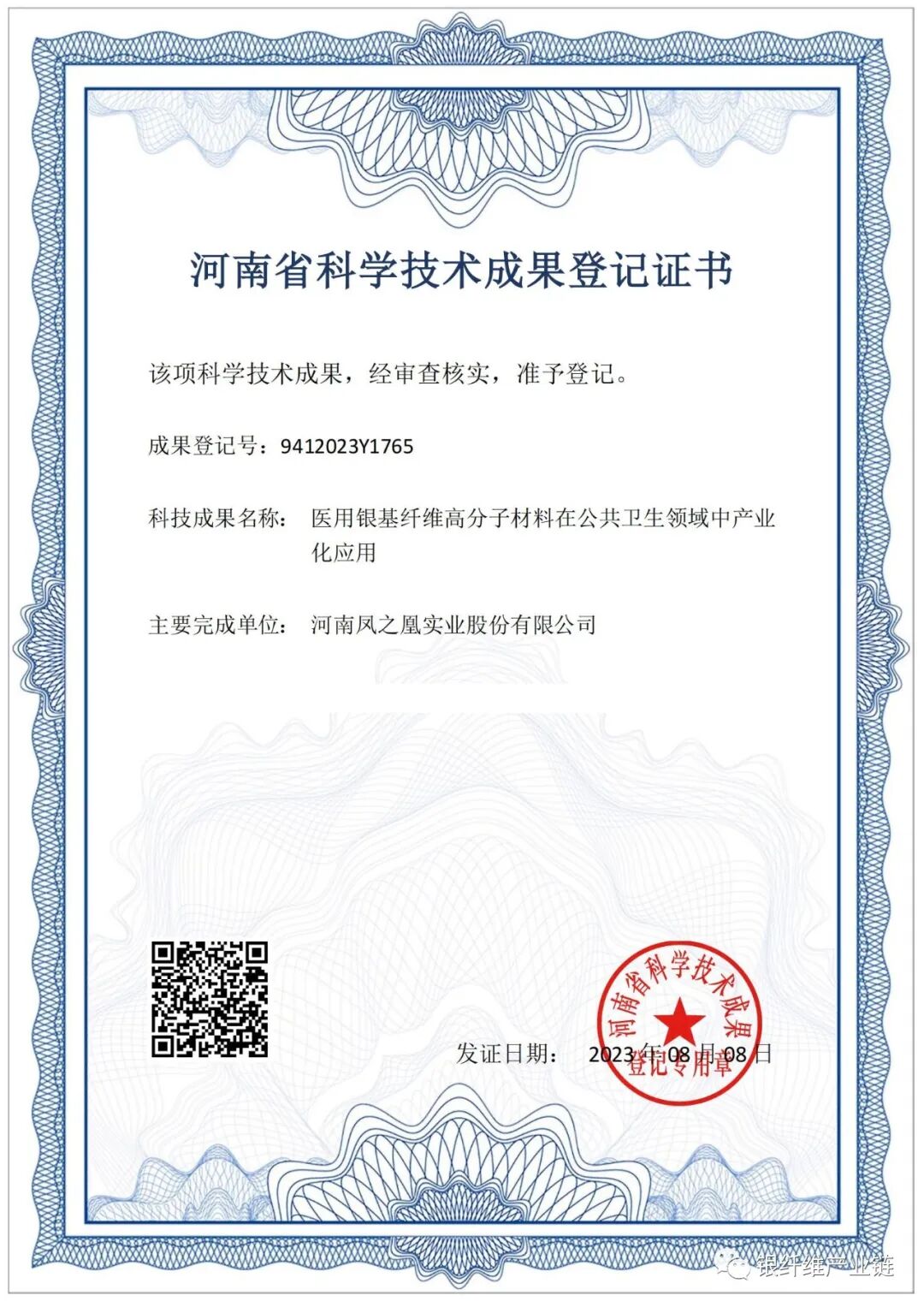 今年8月20日,依据科技部《科学技术评价办法》的有关规定,按照科技成果评价的标准及程序,经评价委员会全面审核,与会专家一致同意,河南凤之凰实业股份有限公司完成的“医用银基纤维高分子材料在公共卫生领域中产业化应用”项目设计合理,实用性强,该医用银基纤维高分子材料在公共卫生领域产业化应用方面有创新,达到国际先进水平。