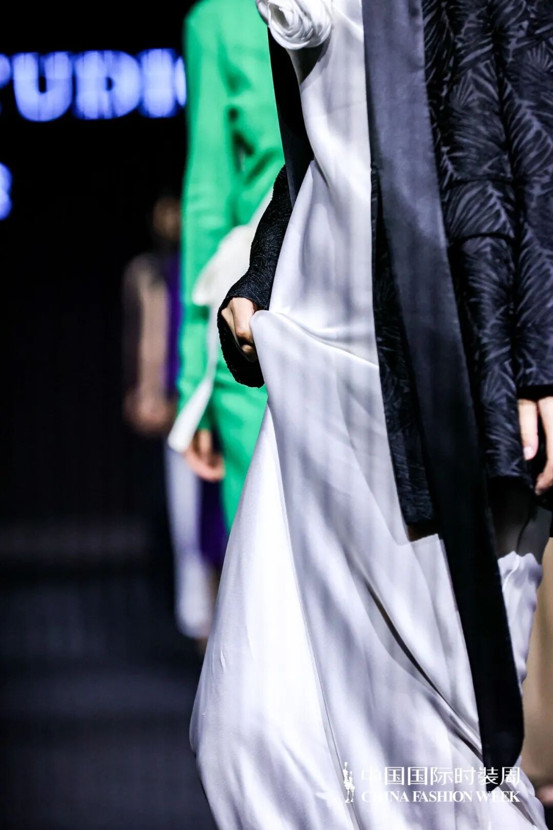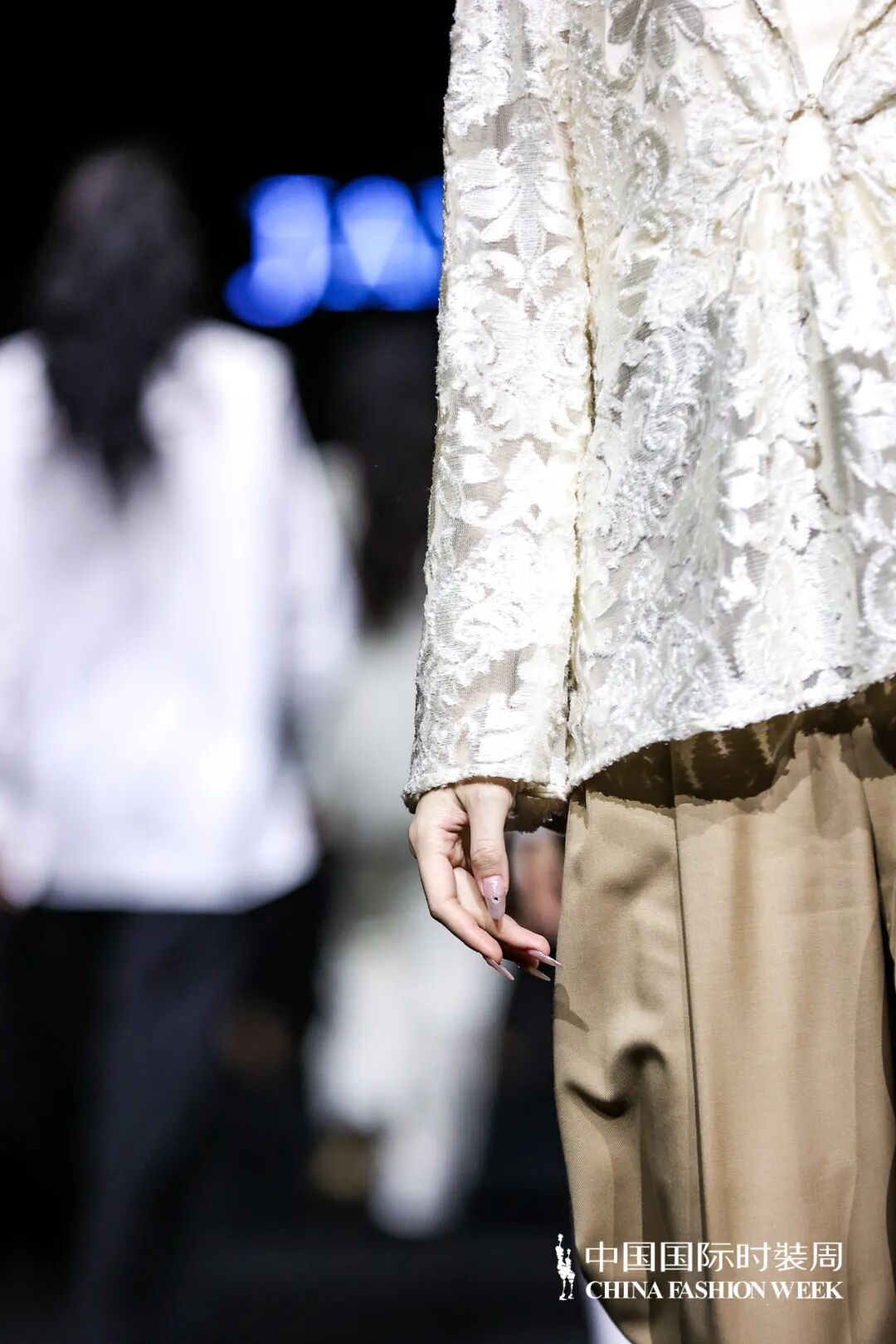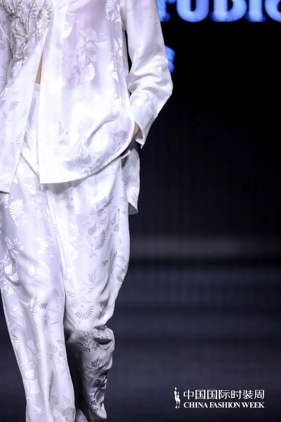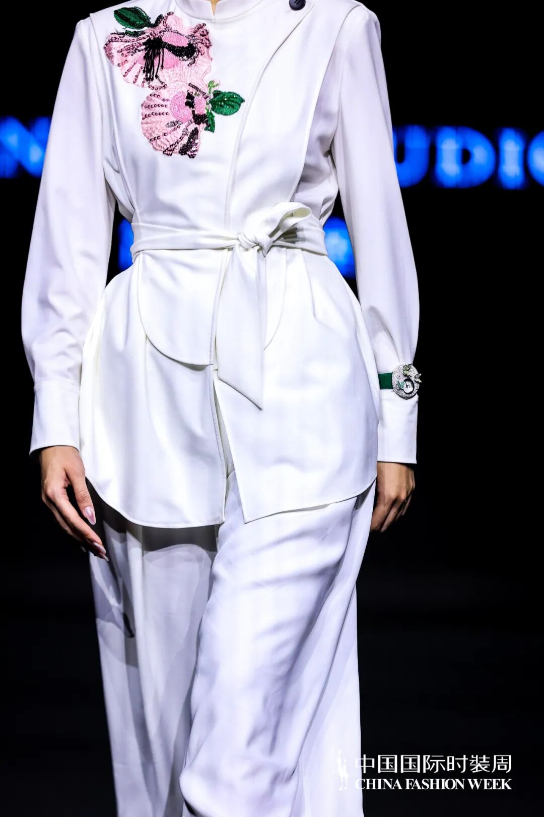 本次发布会成衣系列分为新中式元素系列、连衣裙系列、西装系列三大部分,简洁明快的职场套装融入新中式设计元素,尽展国风新风尚。设计师通过精湛的版型、剪裁结合钉珠、刺绣、亮片等工艺,让职业装适用更多社交、生活场景。