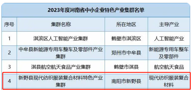 今年,河南省工信厅对2023年度河南省中小企业特色产业集群拟确定名单(共20家)进行公示,新野县现代纺织服装复合材料特色产业集群为其中之一。