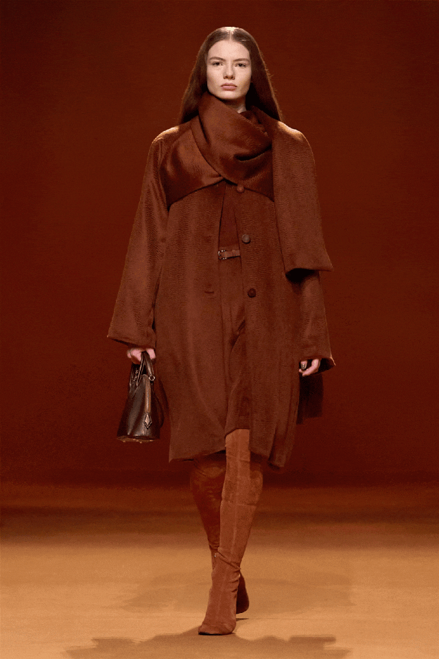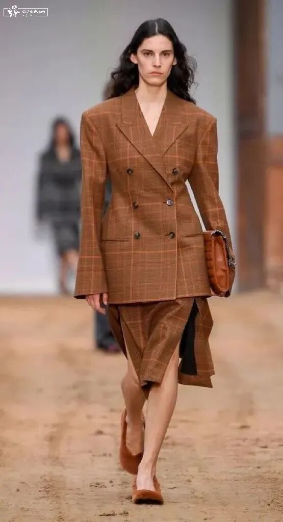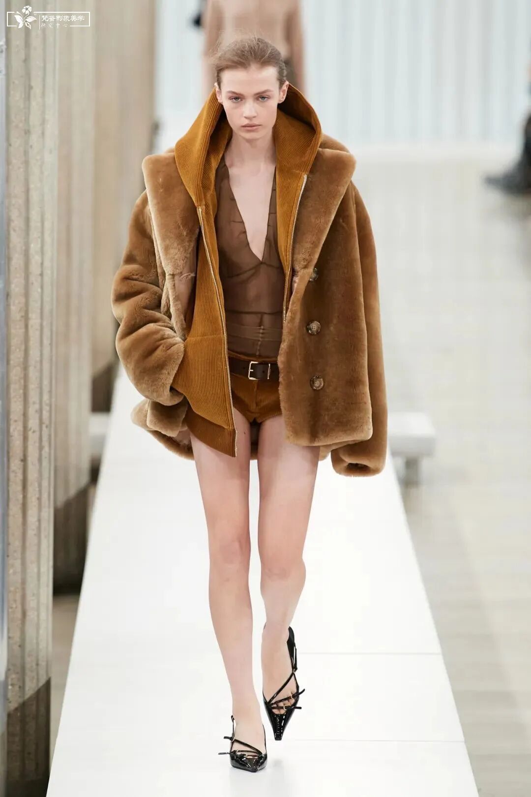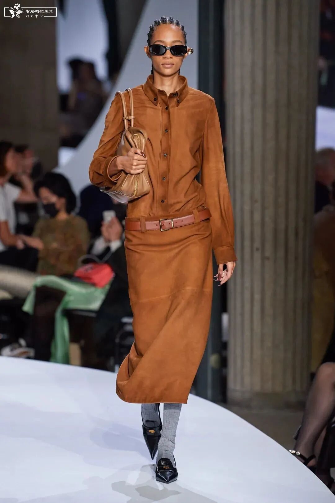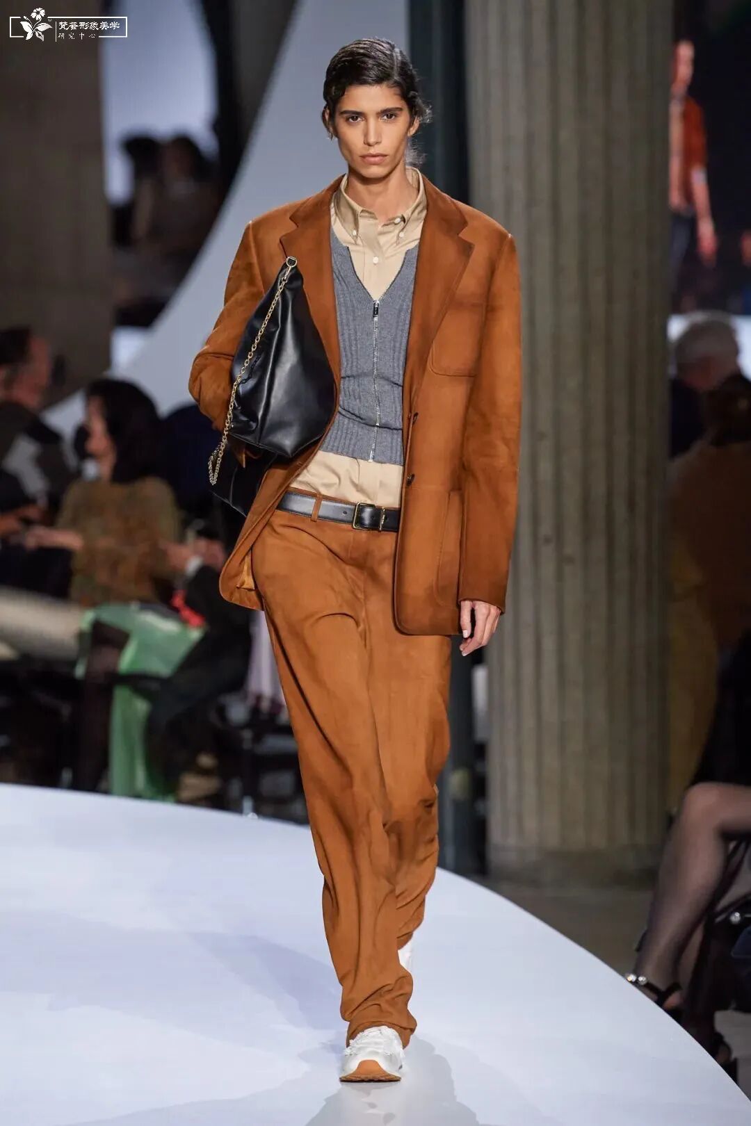 不论是麂皮长靴还是水波纹羊绒大衣,又或是闪着珠光的针织杉和波光粼粼的水貂绒外套,都把美拉德色系玩出了高贵典雅的质感。