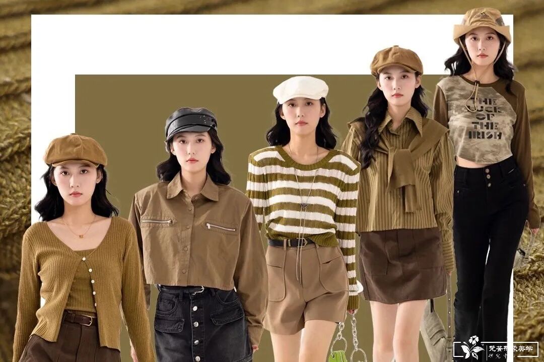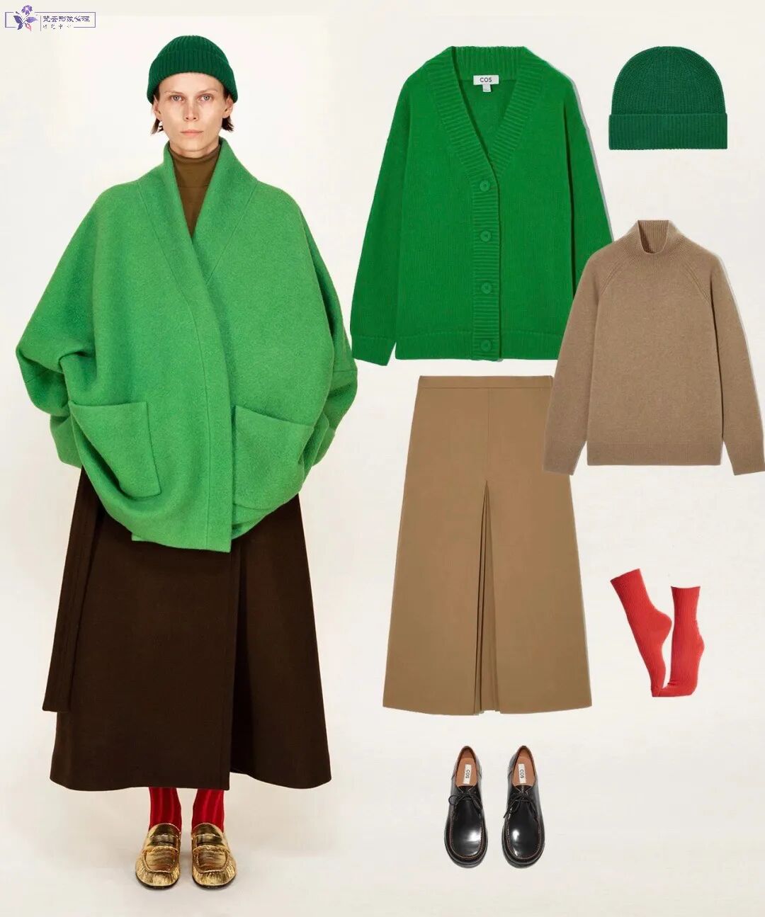 从美拉德色系由深到浅这么多颜色里选两个颜色的单品,进行大面积的颜色搭配。