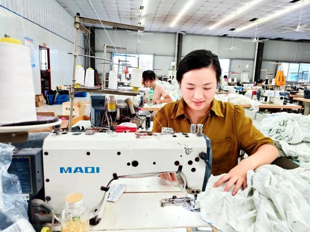 8月24日,在河南省商丘市民权县程庄镇楚东村红珊瑚服饰有限公司,机器设备井然有序,几十台缝纫机飞快转动着,工人们分工明确,缝合、质检……生产工作有条不紊,呈现出一派忙碌的景象。