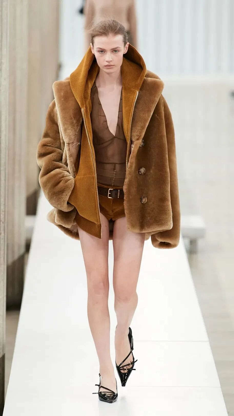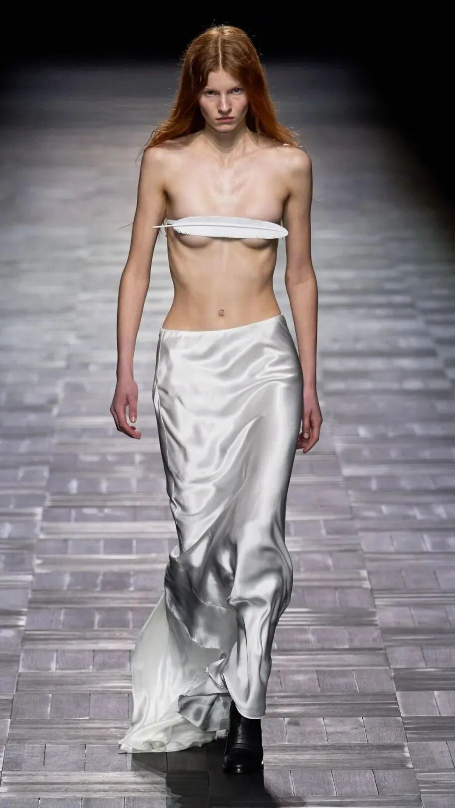 有些品牌是上衣失踪,模特们甚至双手捂着胸部走秀或仅有一只羽毛遮住胸部,有些品牌直接“情趣”内衣上身。