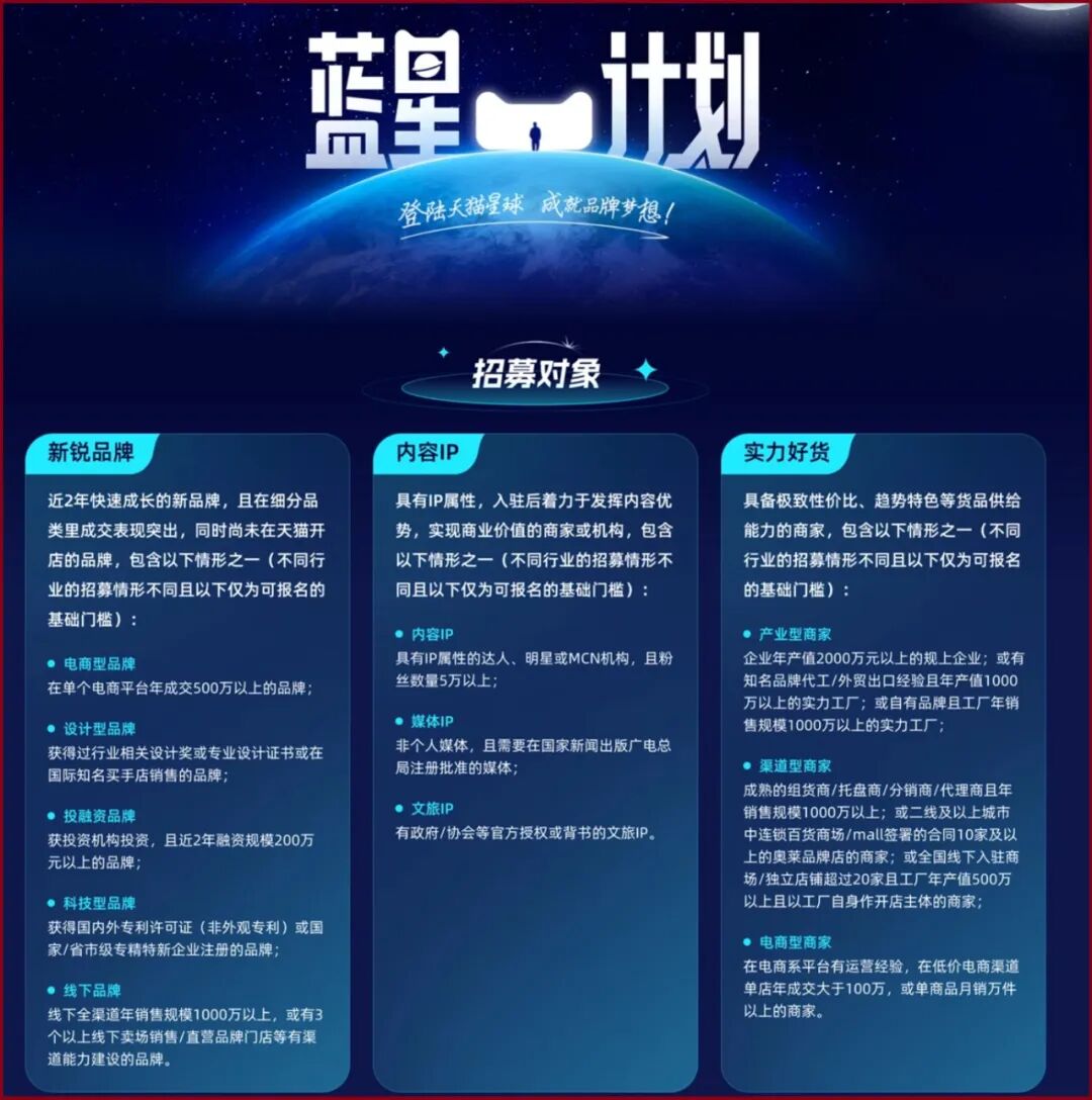 从天猫的官方招商网站(zhaoshang.tmall.com)首页获悉,蓝星计划第一期主要招募三大类型新商家:新锐品牌、内容型商家和实力好货商家。