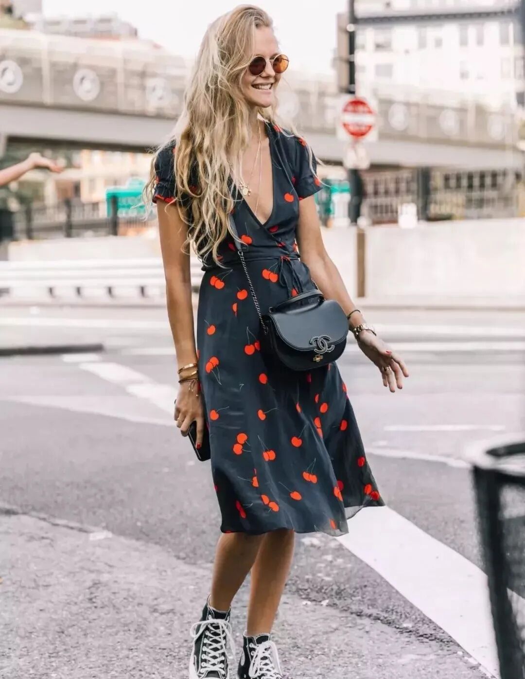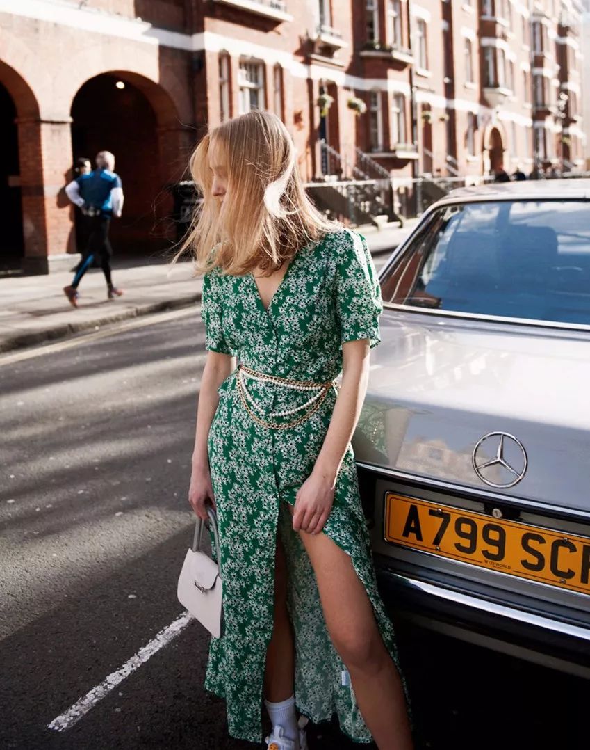 茶歇裙被许多时髦精们盛赞为一条“没什么缺点”的单品,每一处细节设计都能够放大我们的身材优点:深V的领口可以穿出天鹅颈,收紧的腰带突显出纤细腰身,开衩的裙摆不仅增添了造型的清爽度,还能起到修饰腿型又显腿长的作用。
