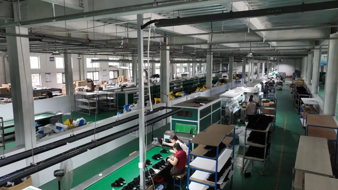 双强皮业有限公司缝帮B组生产线组长周志平说:“我们这条生产线是10个机工、15个手工,工人都是多功能的,每道程序都会,现在的订单量多,有拖鞋和靴子,靴子一天能出货1800到2200双,拖鞋的话可以出货2800到3000双左右。”