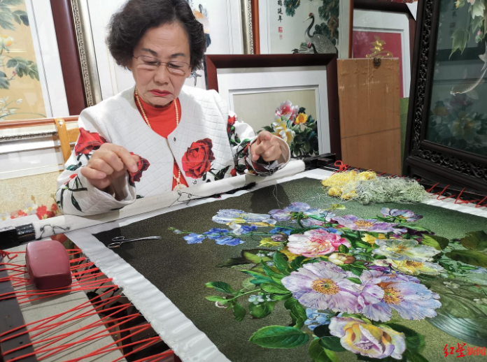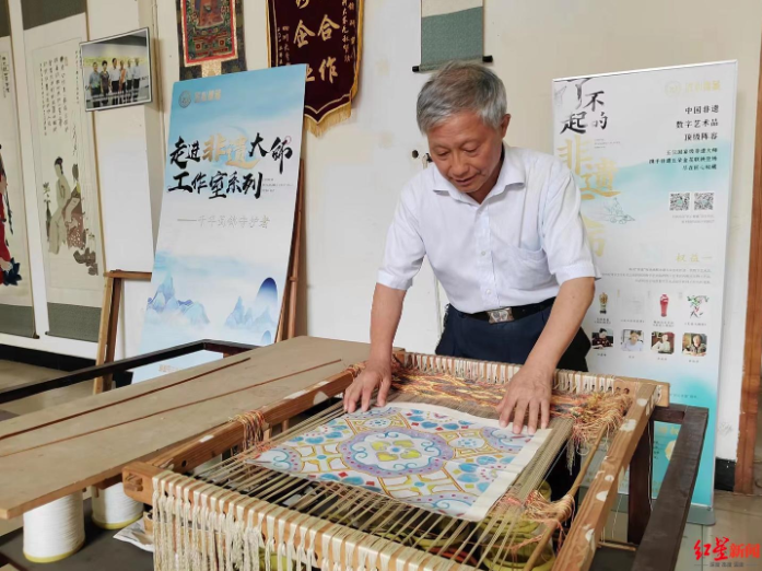 成都大运会奖牌绶带就出自这里。正反面主色分别为蓝色、红色,融入芙蓉花、太阳神鸟、棋盘格等元素,在自然光线下反射出不同的色彩……胡光俊和设计团队一起,在宽2.5厘米、长105厘米左右的绶带上,完成精细复杂的纹样设计并用蜀锦技术制作出来。
