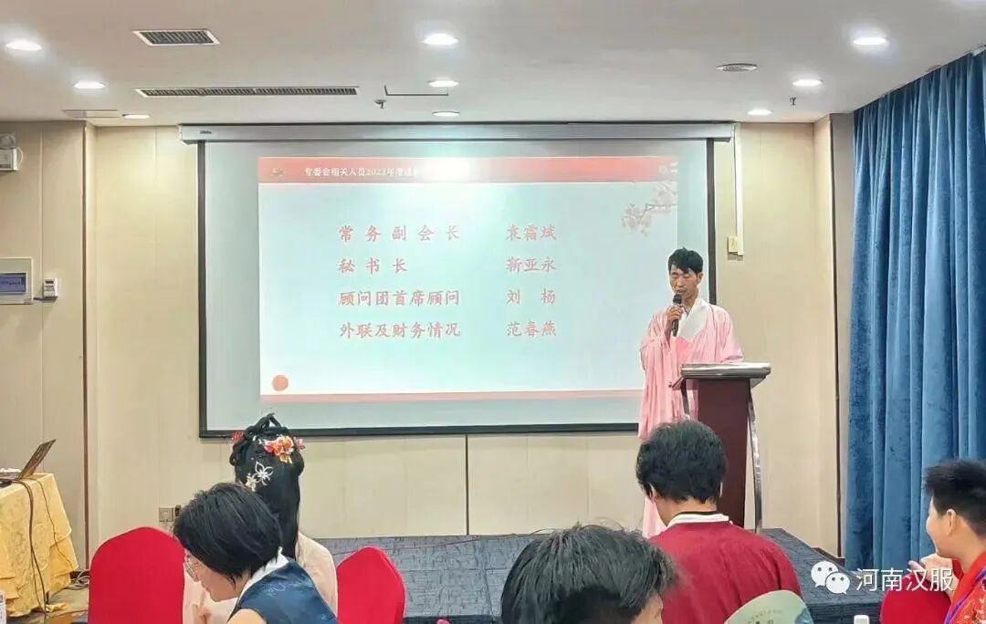 2023年7月29日,第二届河南省服装行业协会汉服专业委员会年会庆典活动在河南省郑州市中弘国际酒店成功举办。河南省服装行业协会汉服专业委员会常务副会长袁霜斌,秘书长靳亚永,顾问刘杨、渠水秀,副秘书长曹世杰、李杰、崔高敏、张卫猛、吴振峰、张筝歌、张芳志等及60余名会员代表共同出席了本次年会。