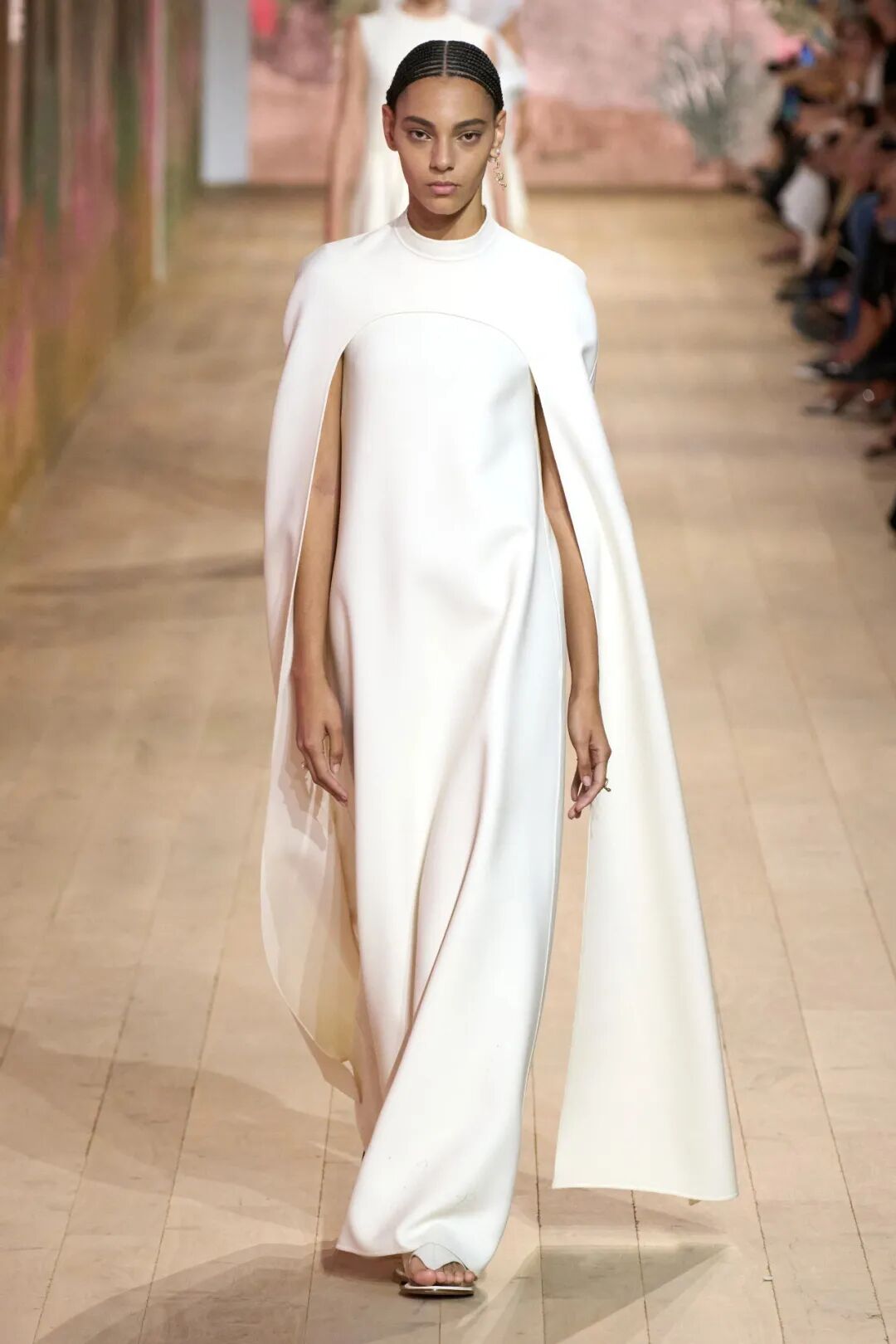 雄伟的斗篷再次装饰设计师的时装系列。因此,Valentino在精致丝绒制成的蓝色连衣裙上添加了一条长斗篷,上面有数百个闪闪发光的小玩意,Christian Dior推出了一件象征新娘形象的乳白色连体斗篷连衣裙, Giambattista Valli在黑色迷你连衣裙上装饰了戏剧性的斗篷,宽大的肩膀,具有皇家美学。